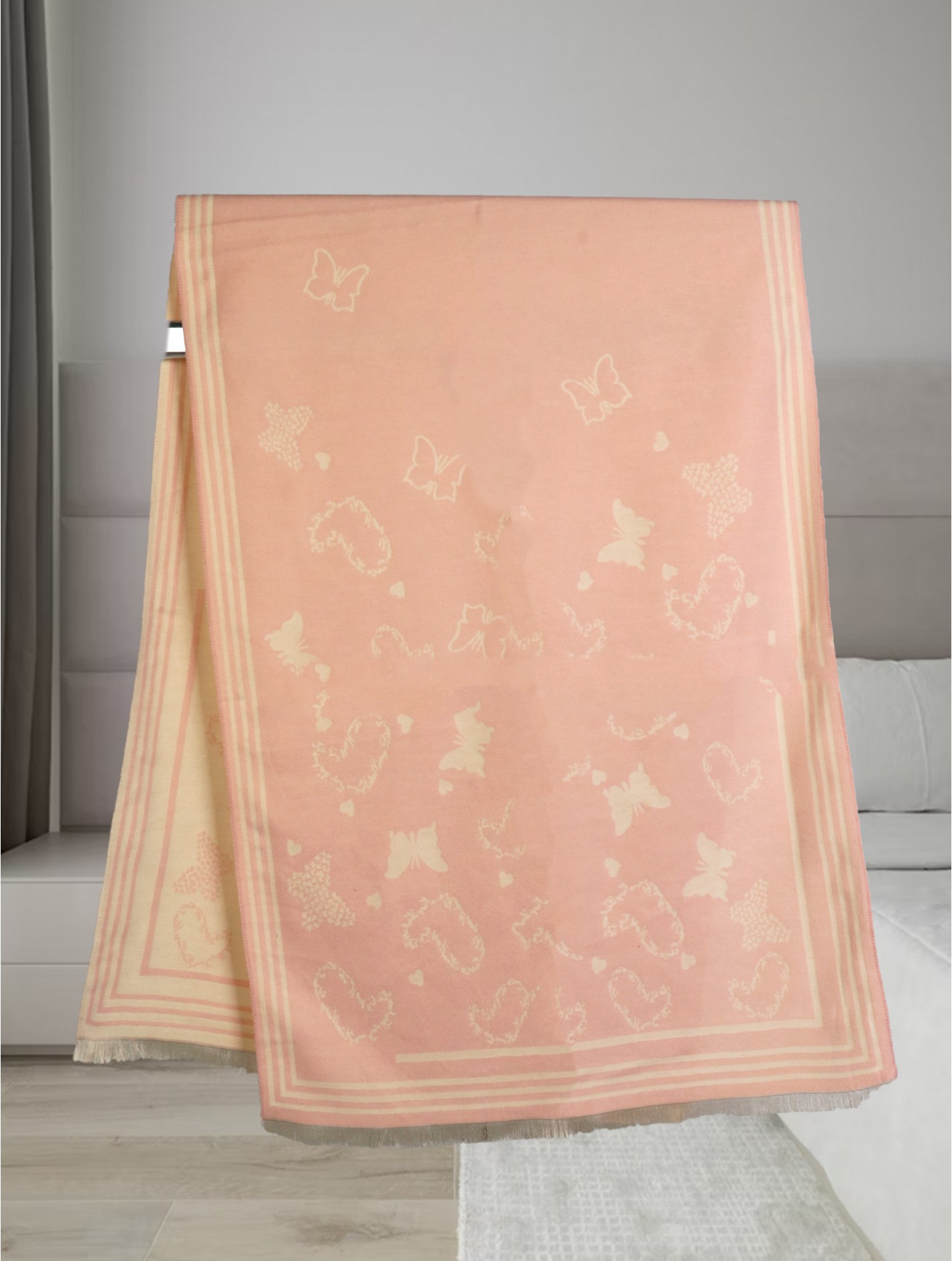 Add a touch of whimsy and warmth to your wardrobe with our Butterfly & Hearts Design Blanket Scarf — a soft, stylish accessory that’s as charming as it is cozy. This generously sized scarf features a delicate mix of fluttering butterflies and sweet heart motifs, creating a look that’s feminine, romantic, and effortlessly chic. Minimum 2 Pcs.