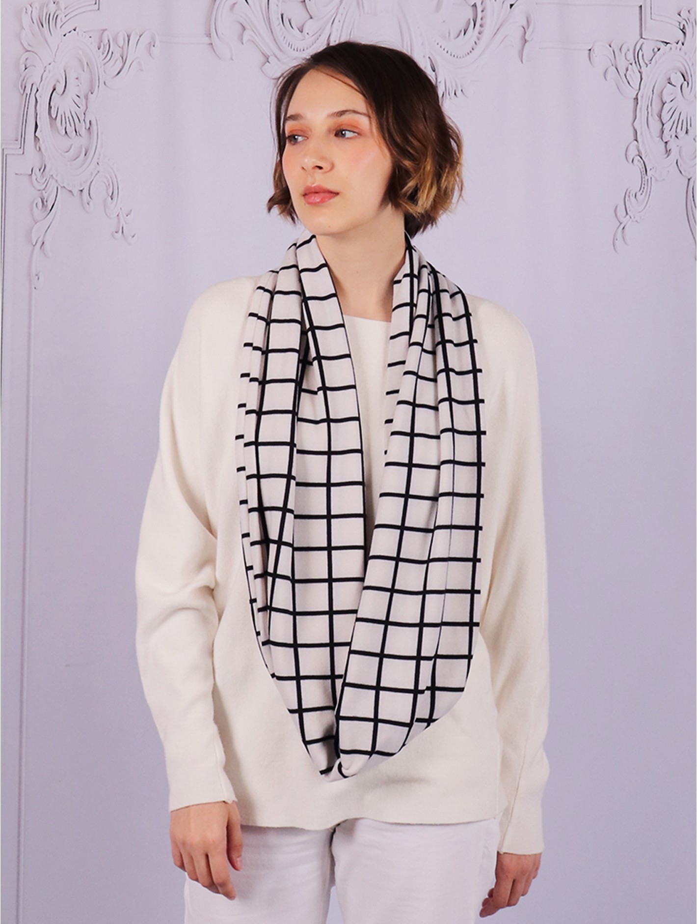 Loop Plaid Print Scarf. Soft feeling and light weight, great for any season. Color: White Minimum 3 Pcs.