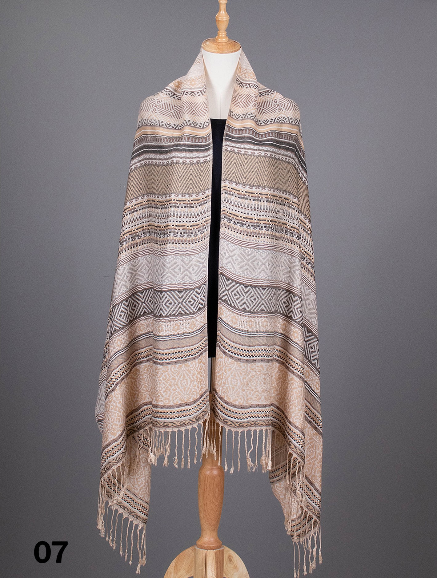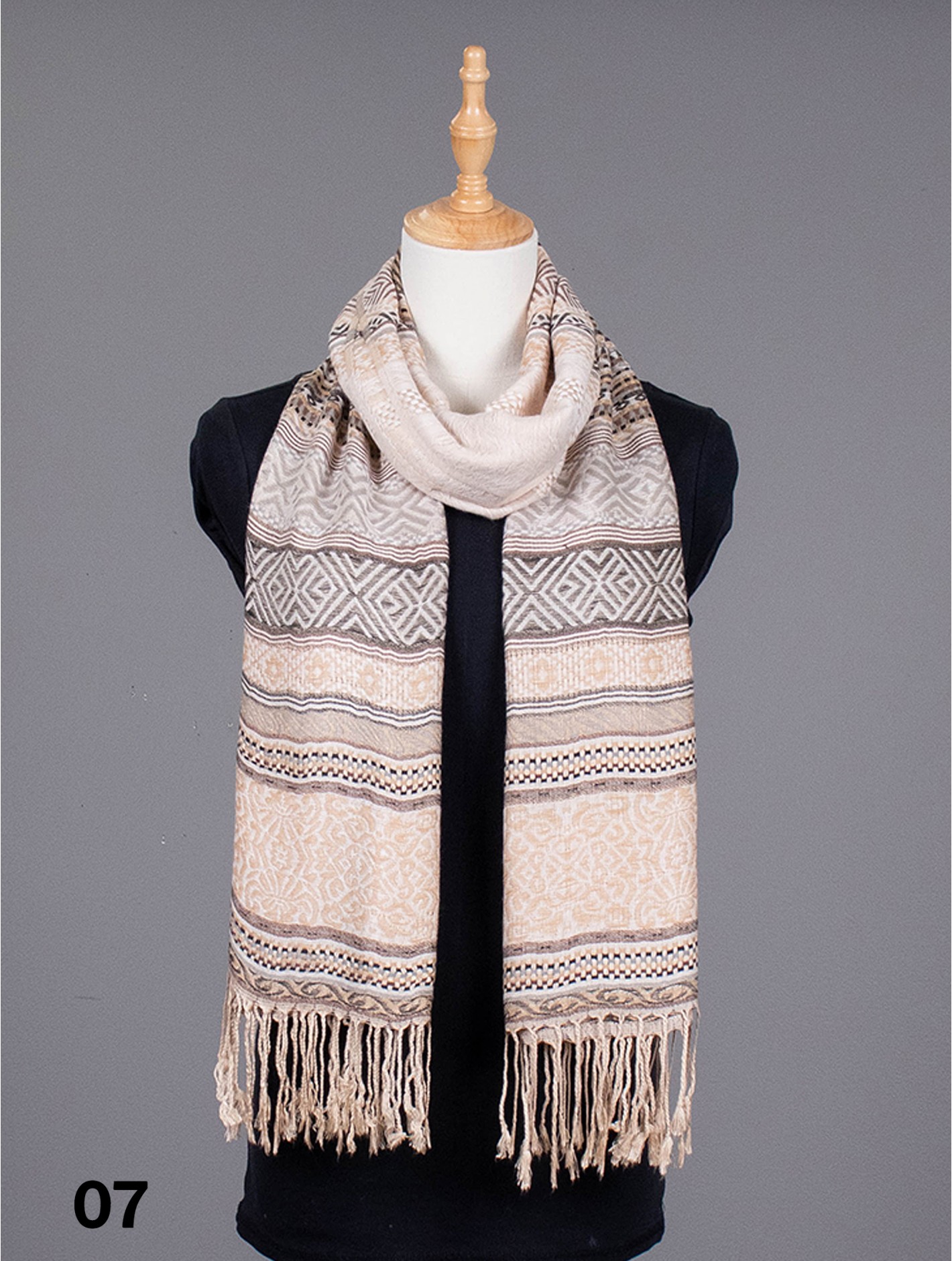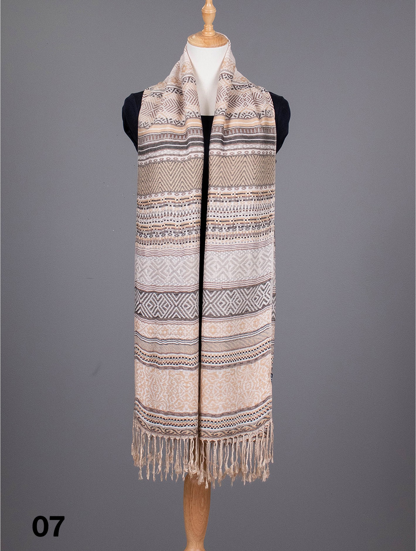- Description: Minimum 2 pcs. Tribal pattern scarf with fringe bottom. Hand-made stitch Detail with soft hand feel. Colour: Taupe