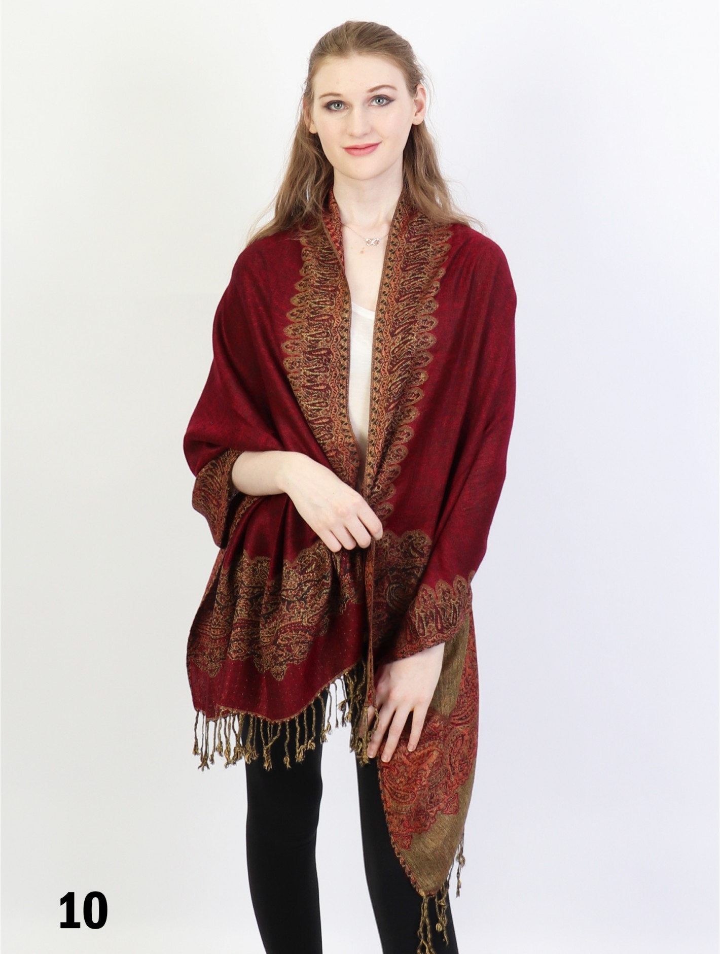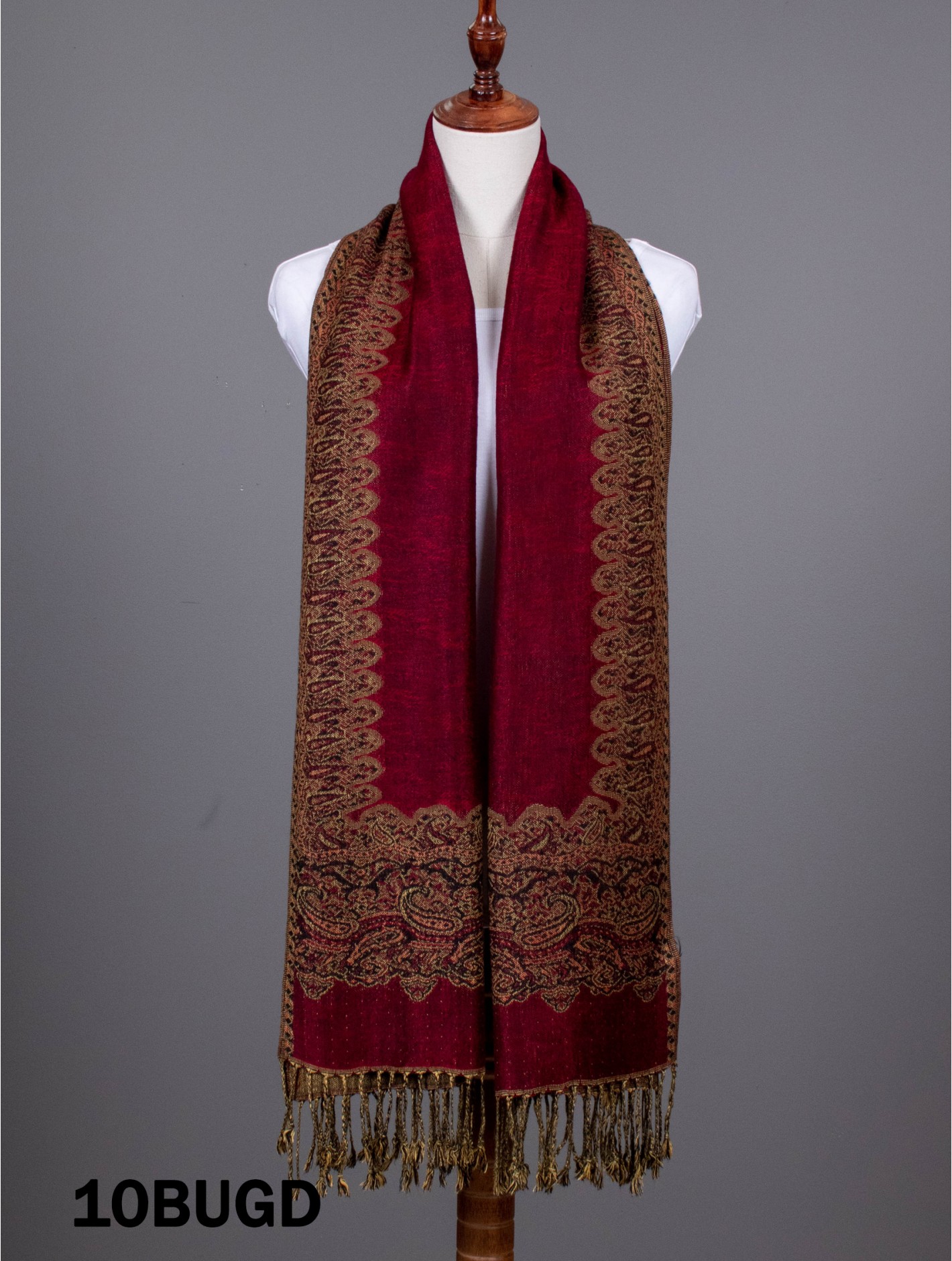 - Description: Minimum 2 pcs. Paisley print pashmina with fringe bottom. variate of colors are available. Colour: Burgundy