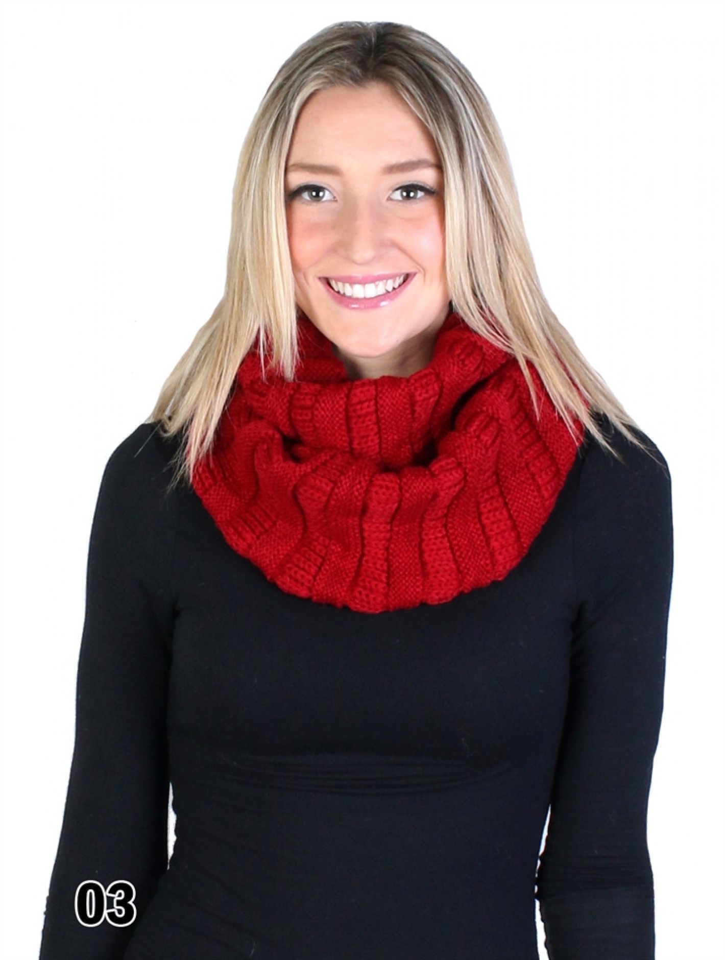 - Description: Minimum 2 pcs. Chunky rib knit loop scarf perfect for the winter season. Can be looped once or twice around the neck. Versatile and warm. Soft Acrylic blend.
