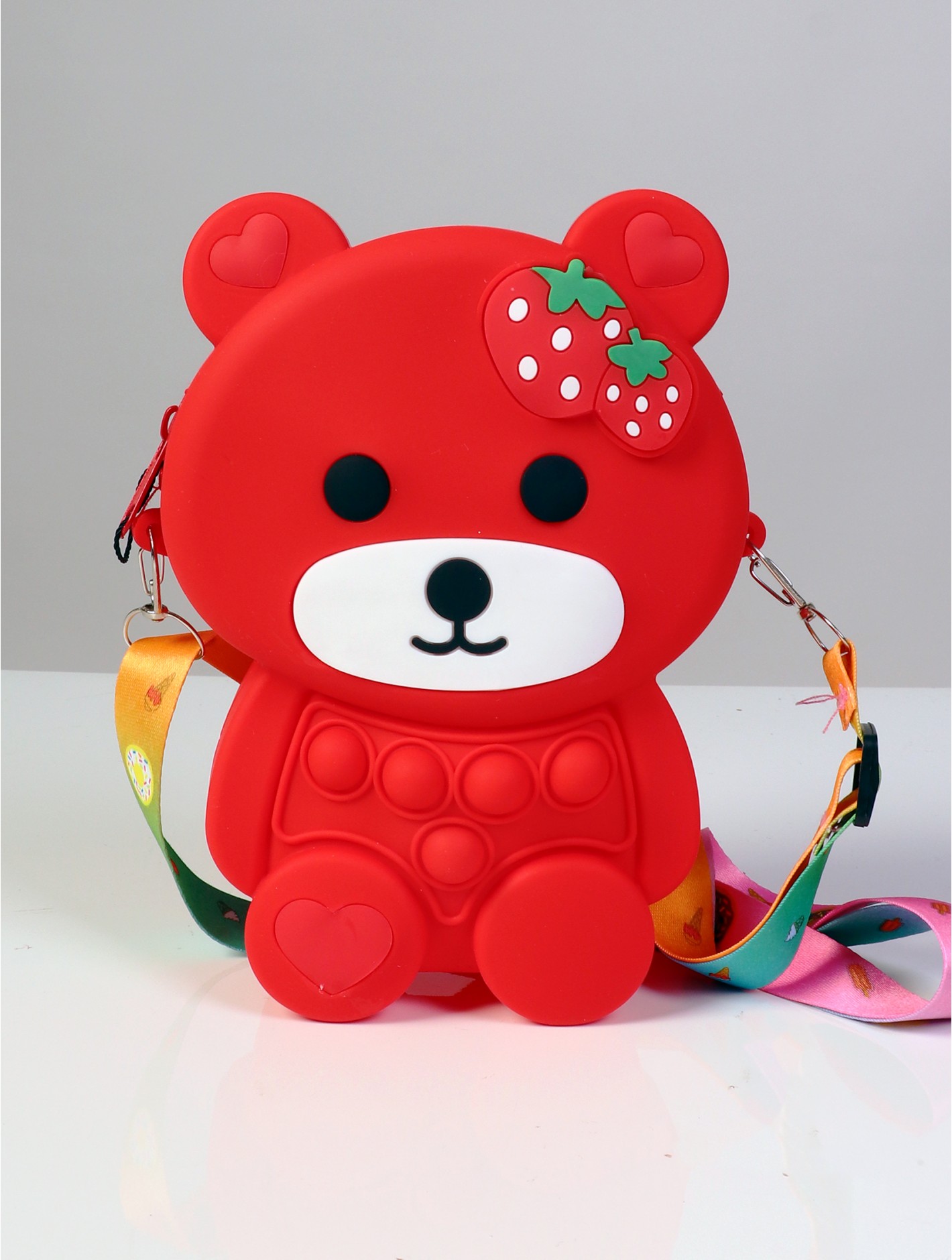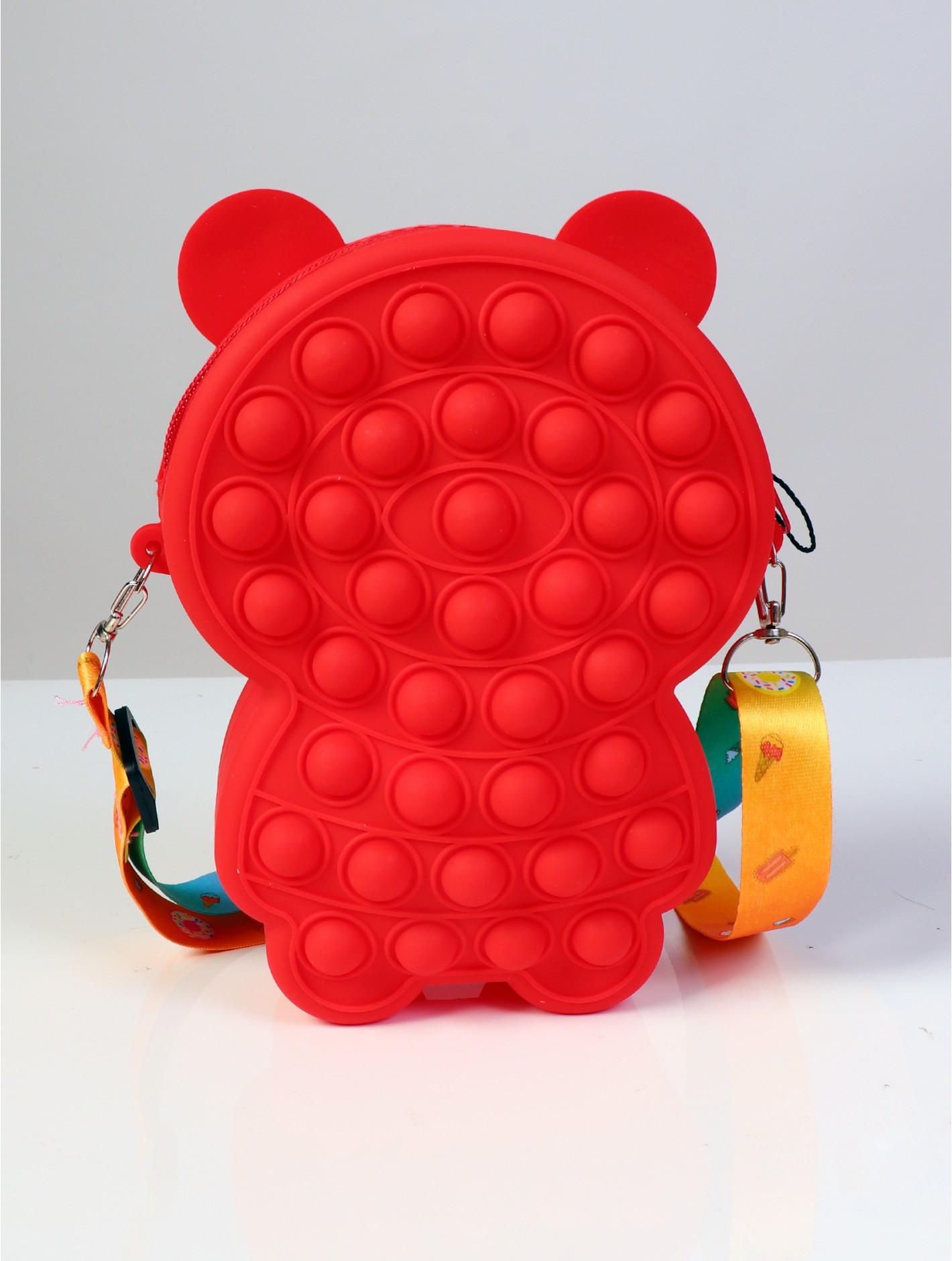 Kids POP-IT Teddy Bear Silicon  Crossbody Purse w/Zipper Closure is super cute to carry around. Have fun with the Pop-it design. Soft silicon finish is safe and durable.  Comes with rainbow colored adjustable strap. Minimum 2