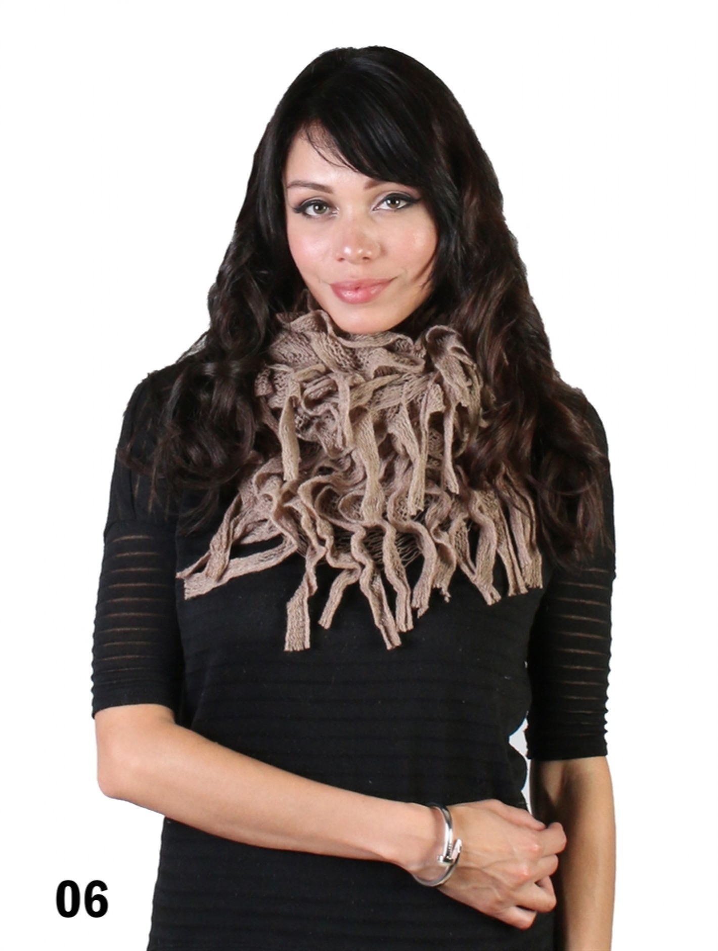 - Description: Minimum 2 pcs Ruffle knit loop scarf with fringe ends. Colour: Taupe