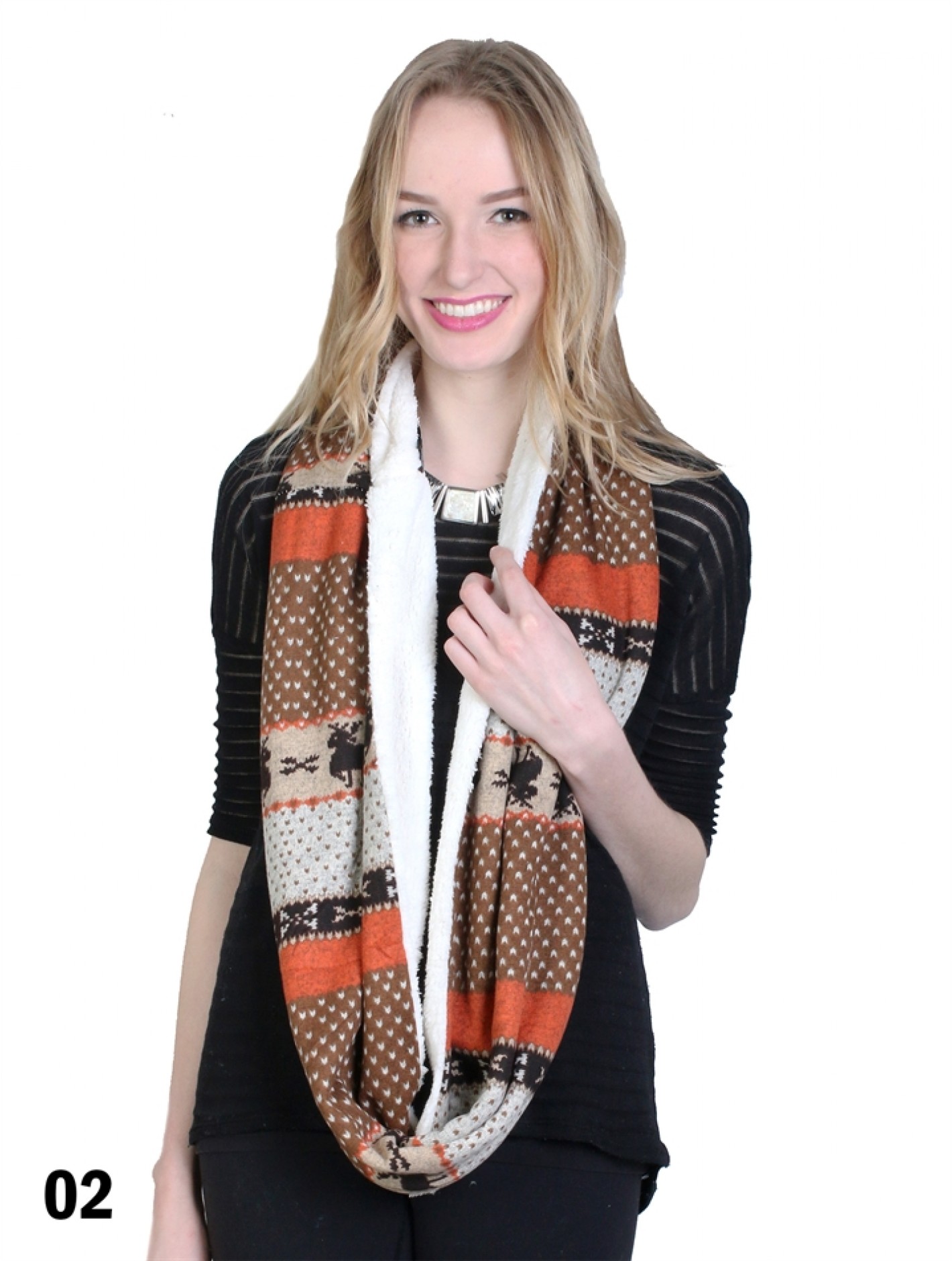 - Description: Minimum 4 pcs. Five colours with moose print loop scarf. Fur-padded on other side. Perfect for the winter season to keep you warm. Colour: Orange and Khaki