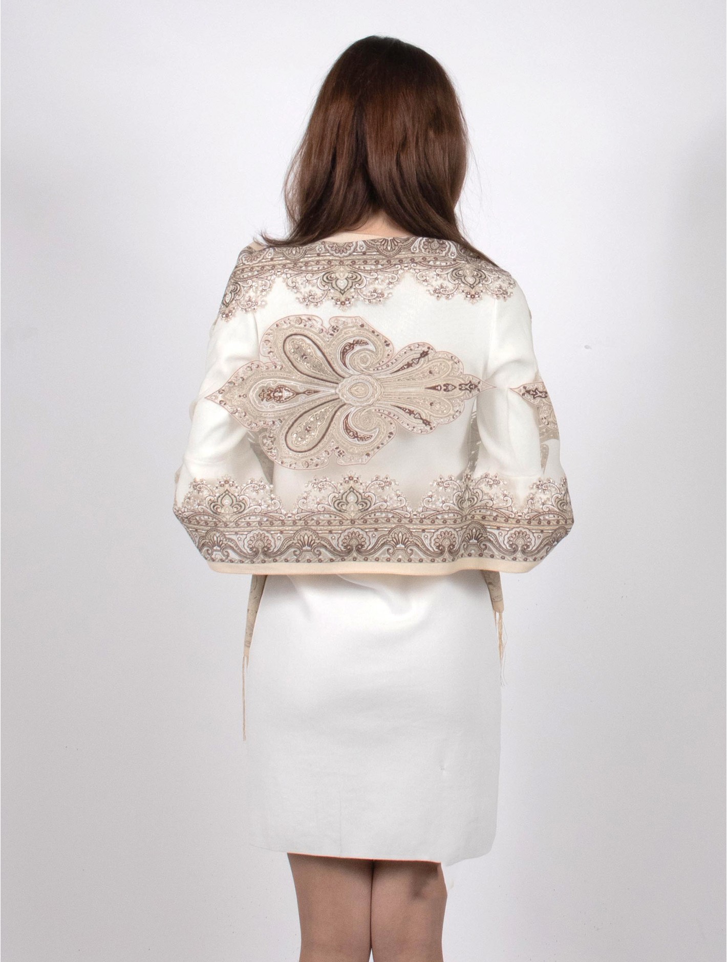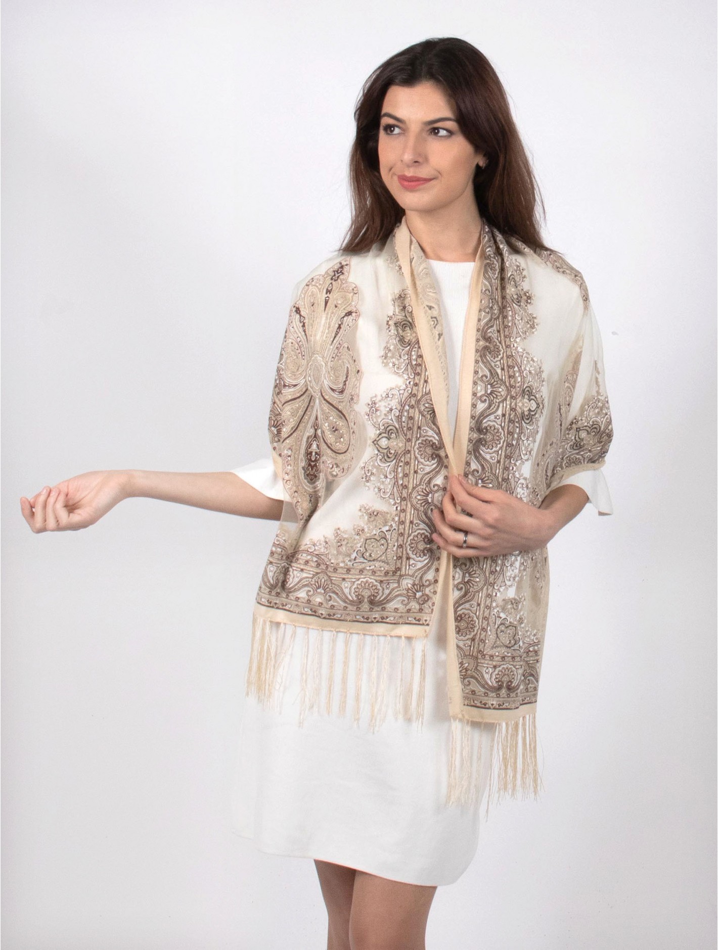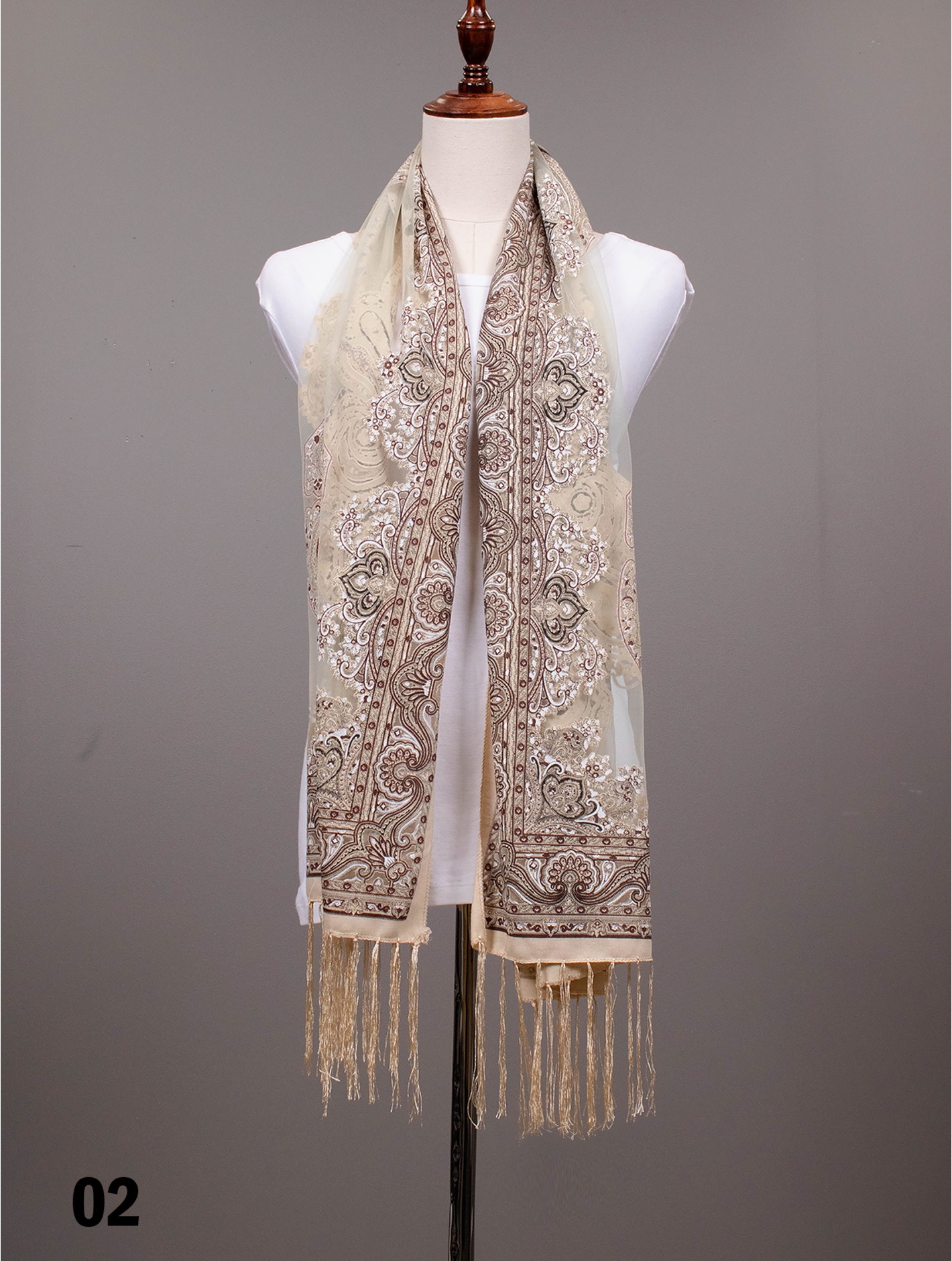 Minimum 2 Pcs. Floral lurex and mesh style scarf with long fringe. 100 Poly. Colour: Beige