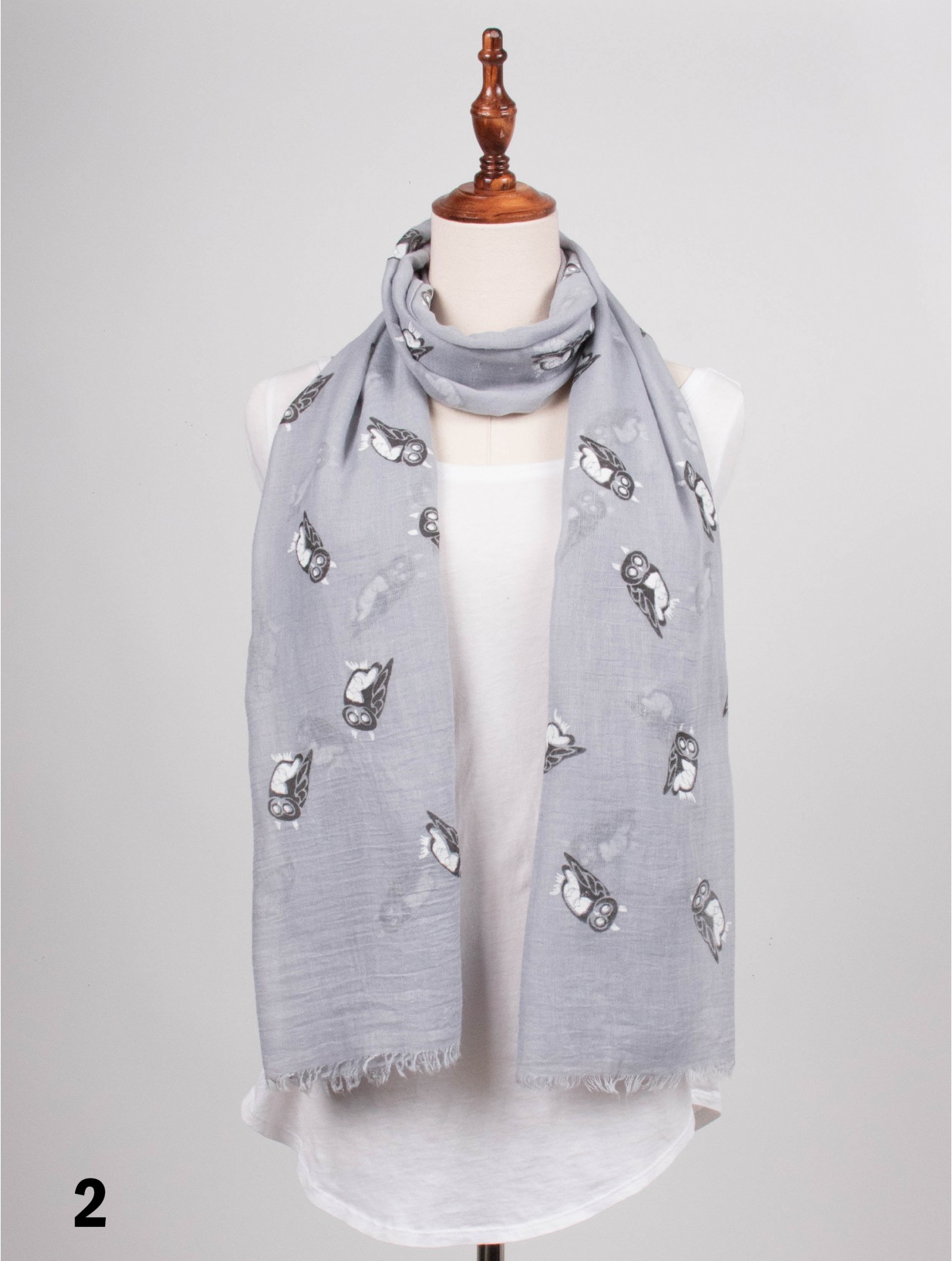 - Description: Minimum 4 pcs. . Owl print fashion scarf. Lightly frayed ends. Acrylic and cotton blend for a light weight feel. Colour: Grey