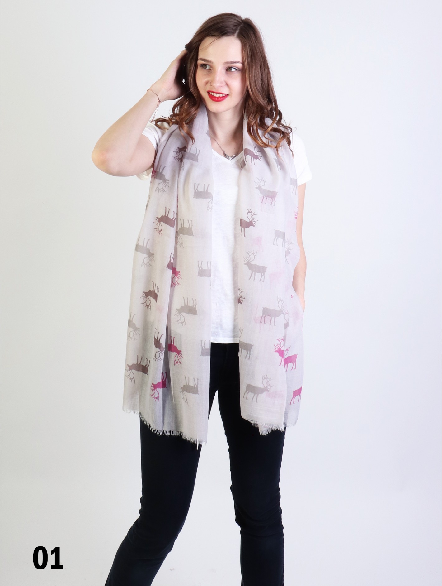 Minimum 2 pcs. Moose print fashion scarf. Lightly frayed ends. Acrylic and cotton blend for a light weight feel. Soft pastel colours, great for any spring and summery styles. Colour: Grey