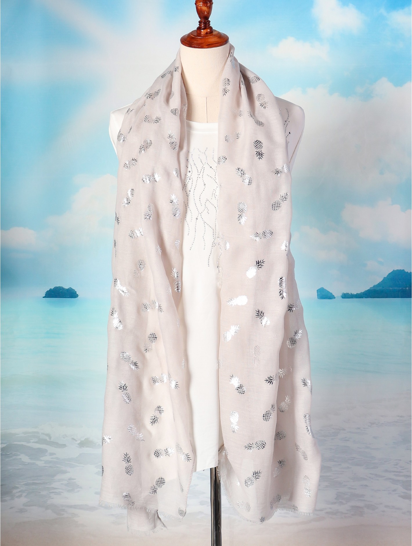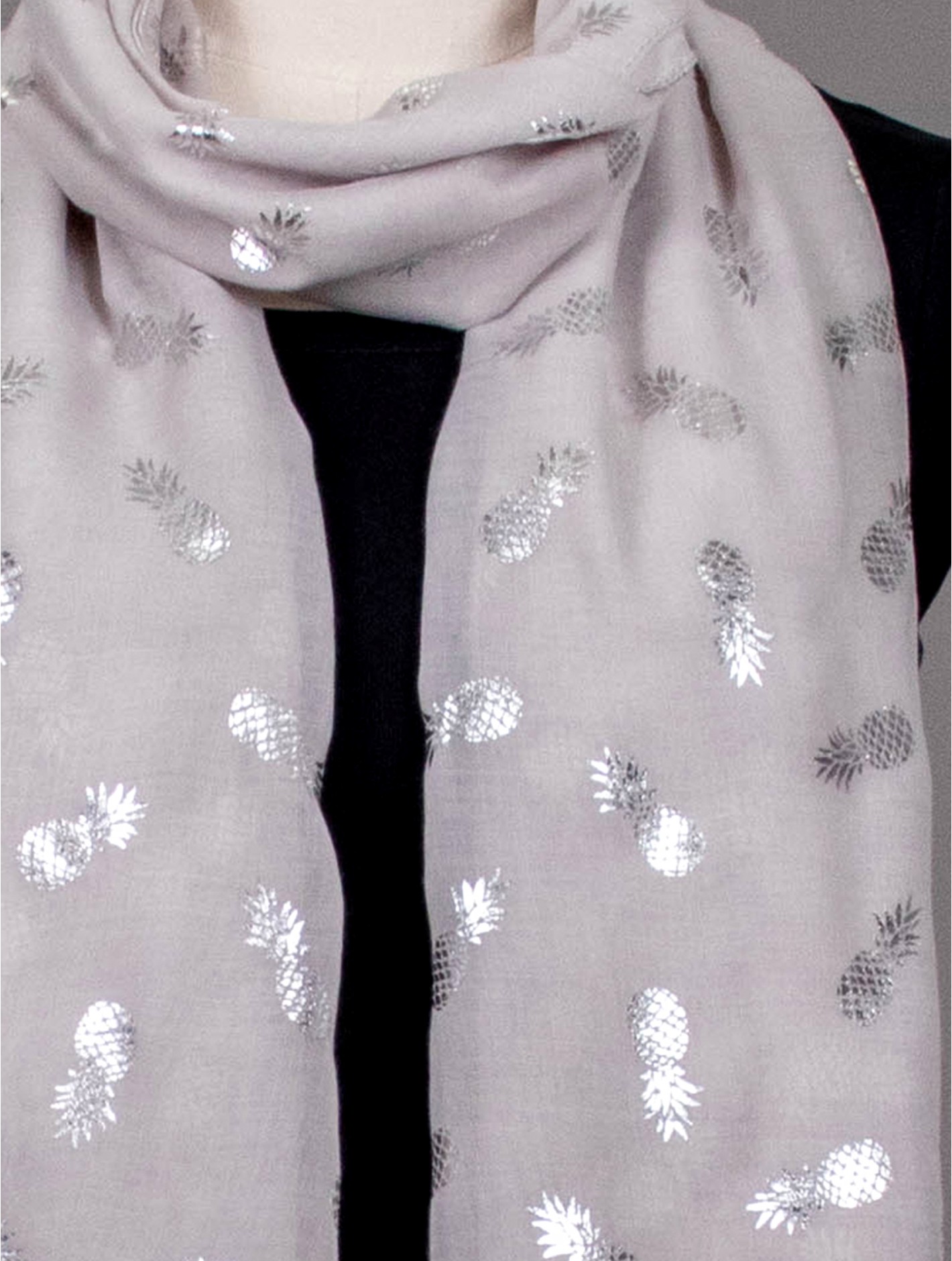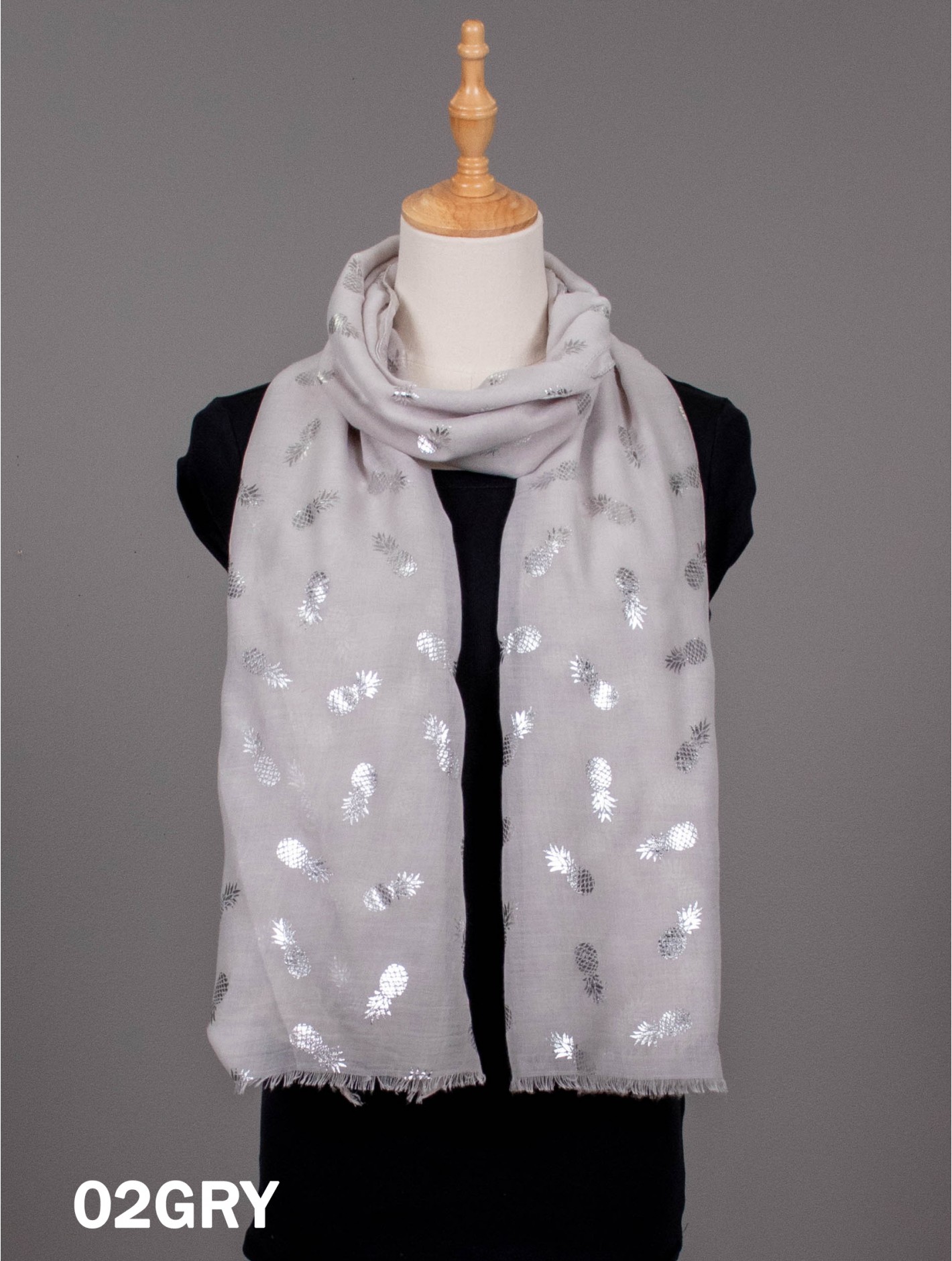 Minimum 4 pcs. Sliver pineapple print fashion scarf. Lightly frayed ends. Acrylic and cotton blend for a light weight feel. Soft pastel colours, great for any spring and summery styles. Colour: Grey