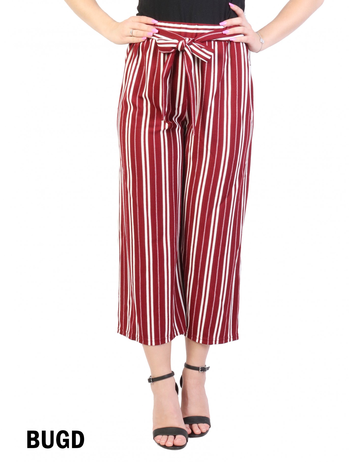 - Description: Minimum 2 pcs. This super soft wide leg striped crop pants takes modern comfort from day to night. This pant has a comfortable stretchy wide waistband, and a versatile belt sewn at the back to ensure safety. Can be dressed up or down. Made of polyester.