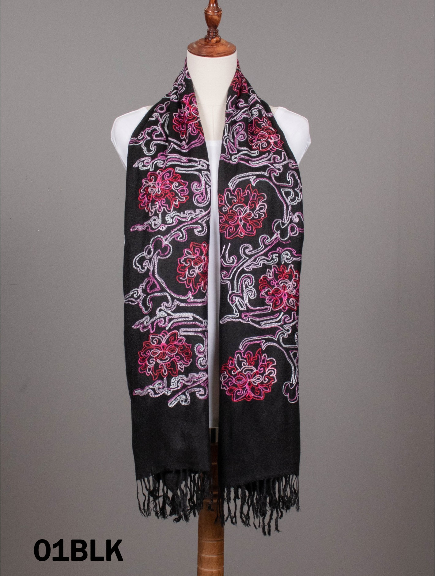 Multi-Colour Thread Flower Embroidery Pashmina Scarf W/ Tassels