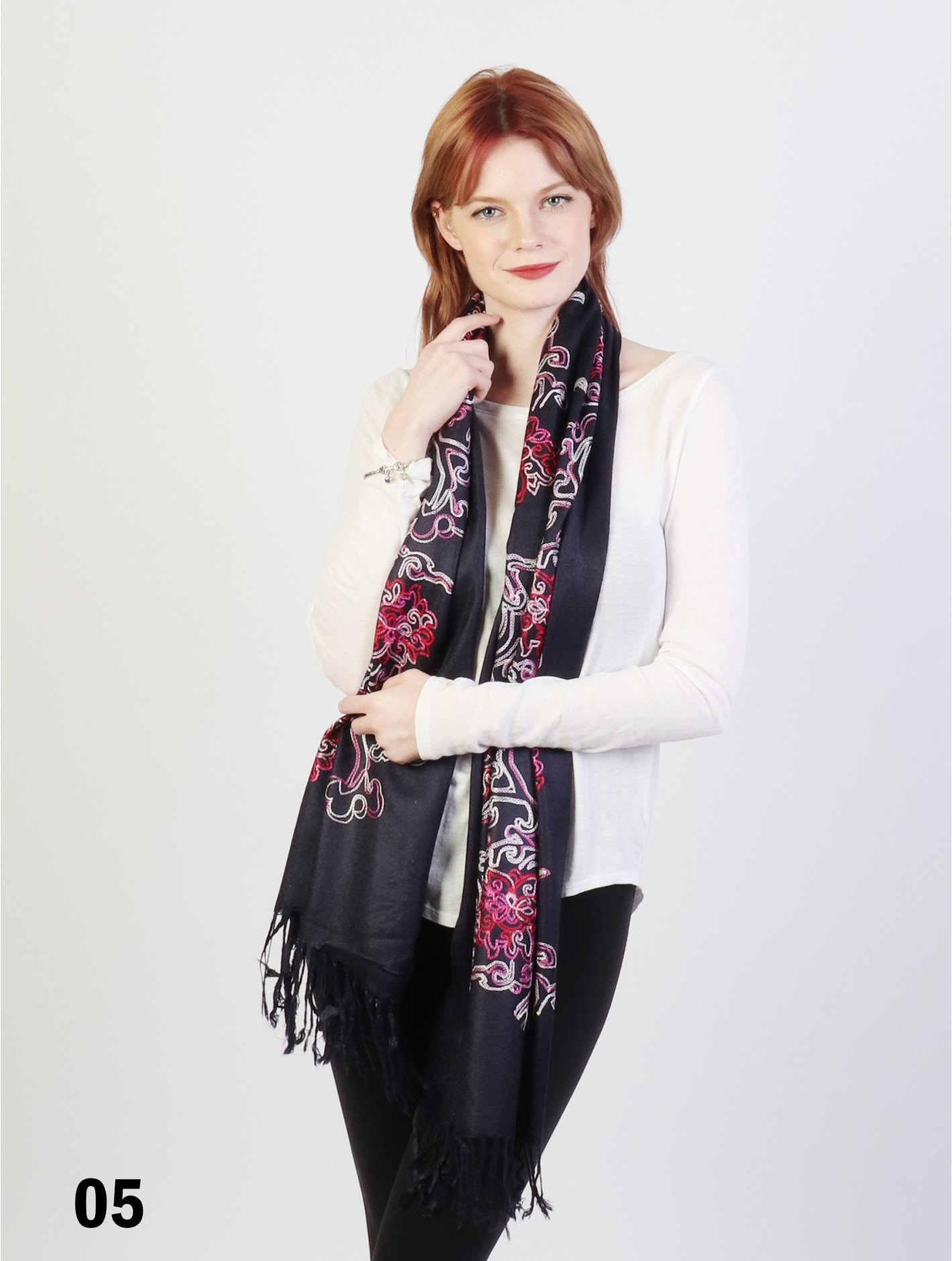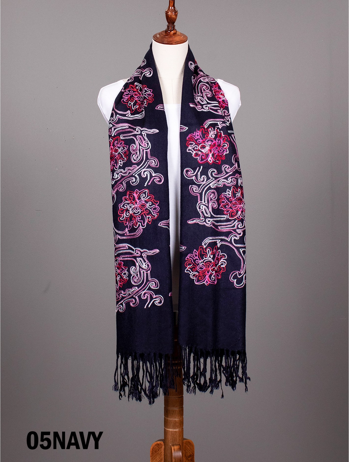 Multi-Colour Thread Flower Embroidery Pashmina Scarf W/ Tassels