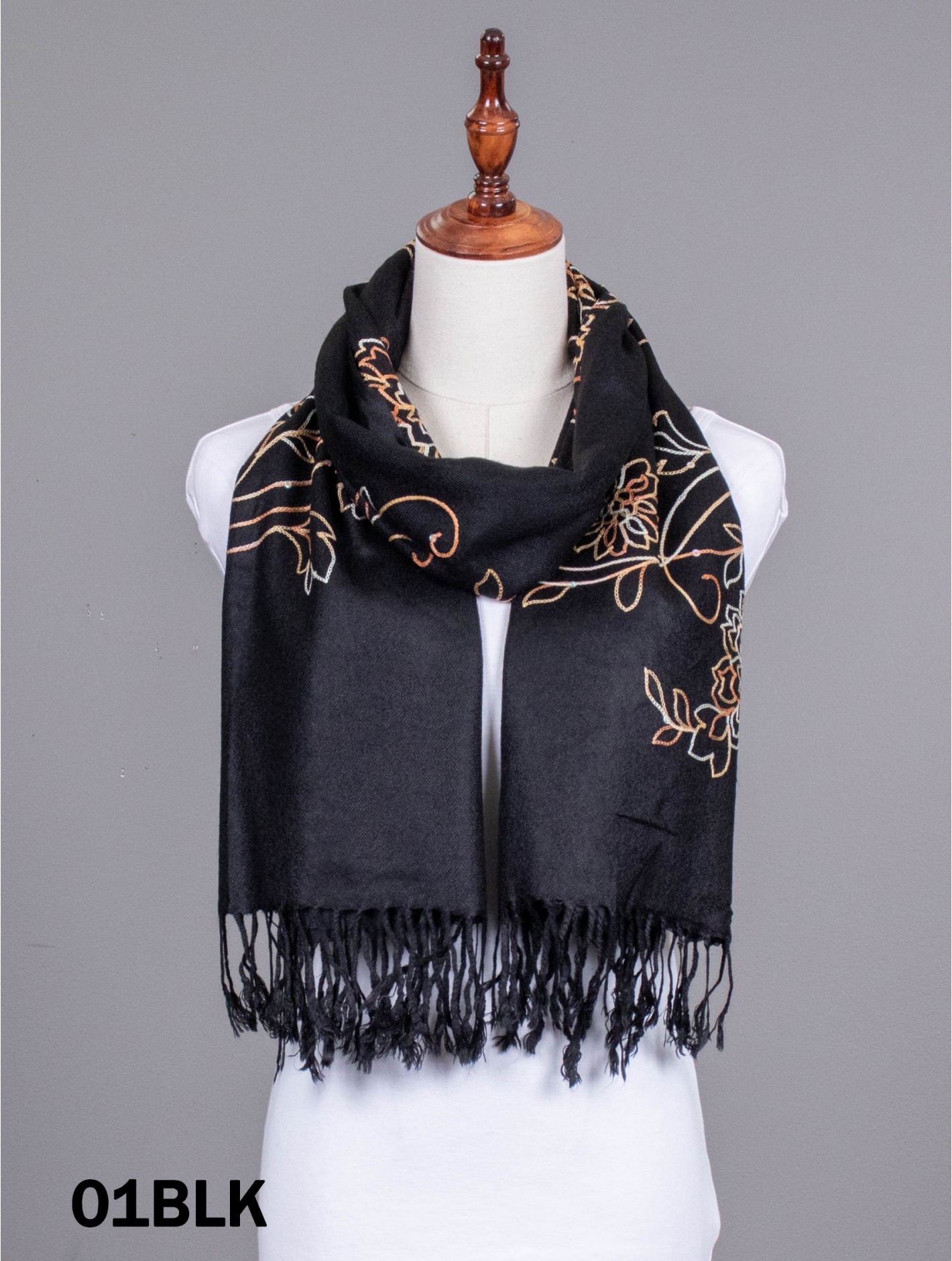 Minimum 2 pcs. Very detailed and unique embroidery design with colourful threads and some sequins for decoration. Scarf is light weighted, easy to trap air and helps to stay warm. Tassels trim. Brings true elegance to fall and winter. Colour: Black