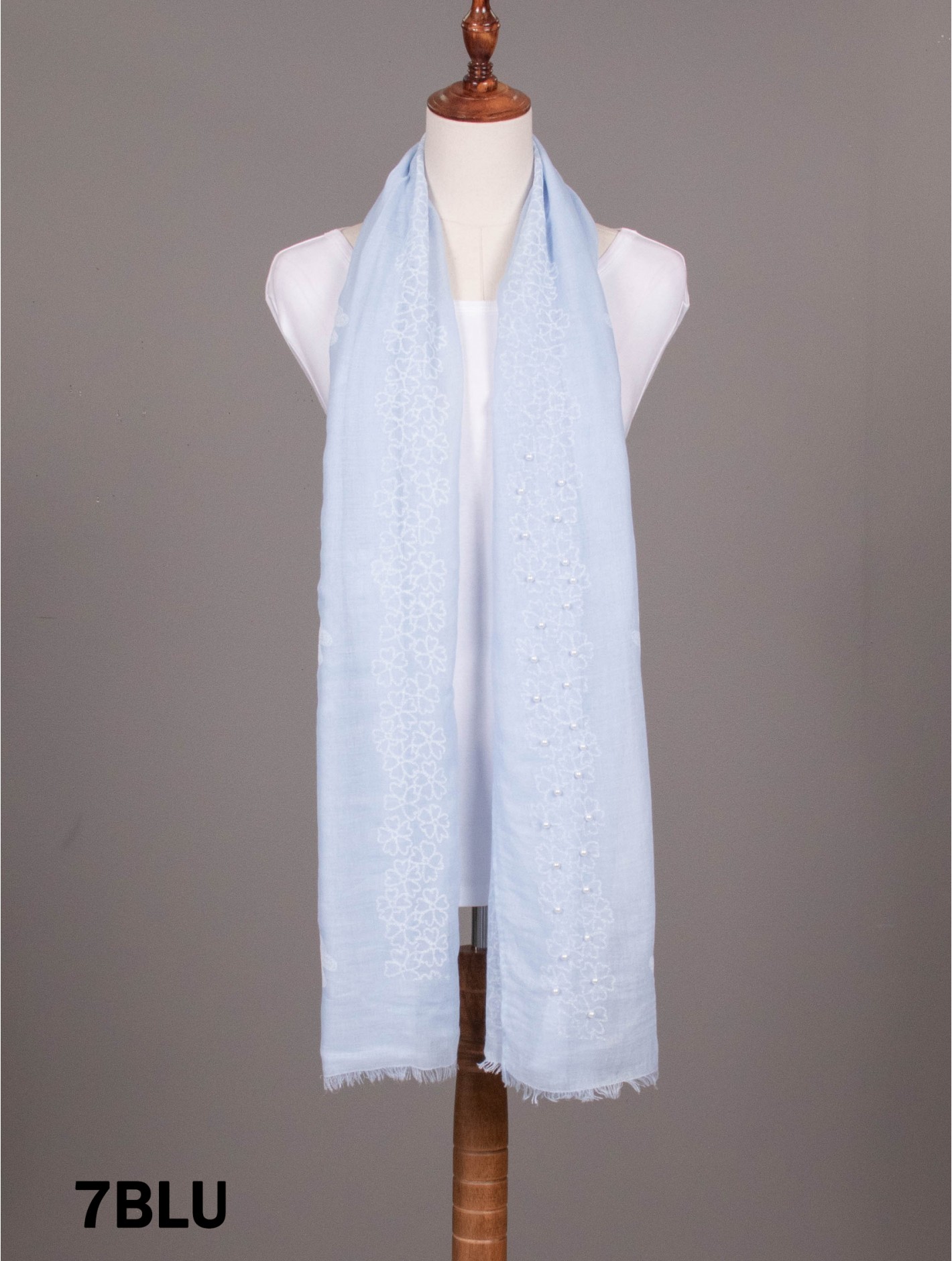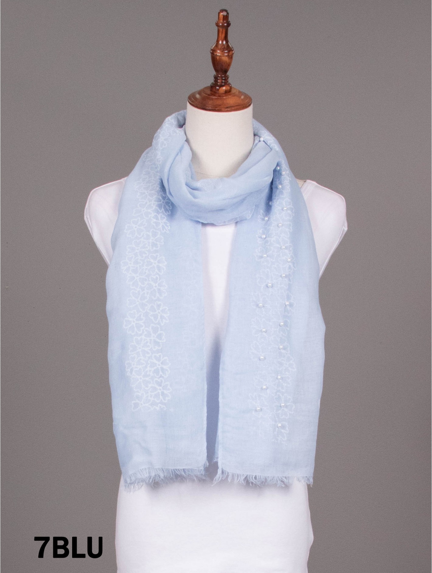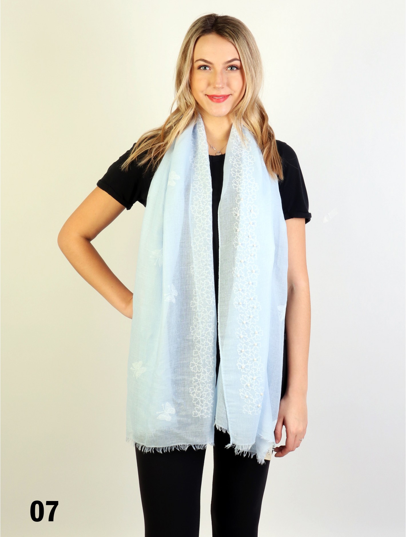 Minimum 4 pcs. GorgeousButterflies & Pearls Stitch Print Fashion Scarf that can be paired with multiple outfits. Light weight fabric that is great for any spring and summery styles. Colour: Blue