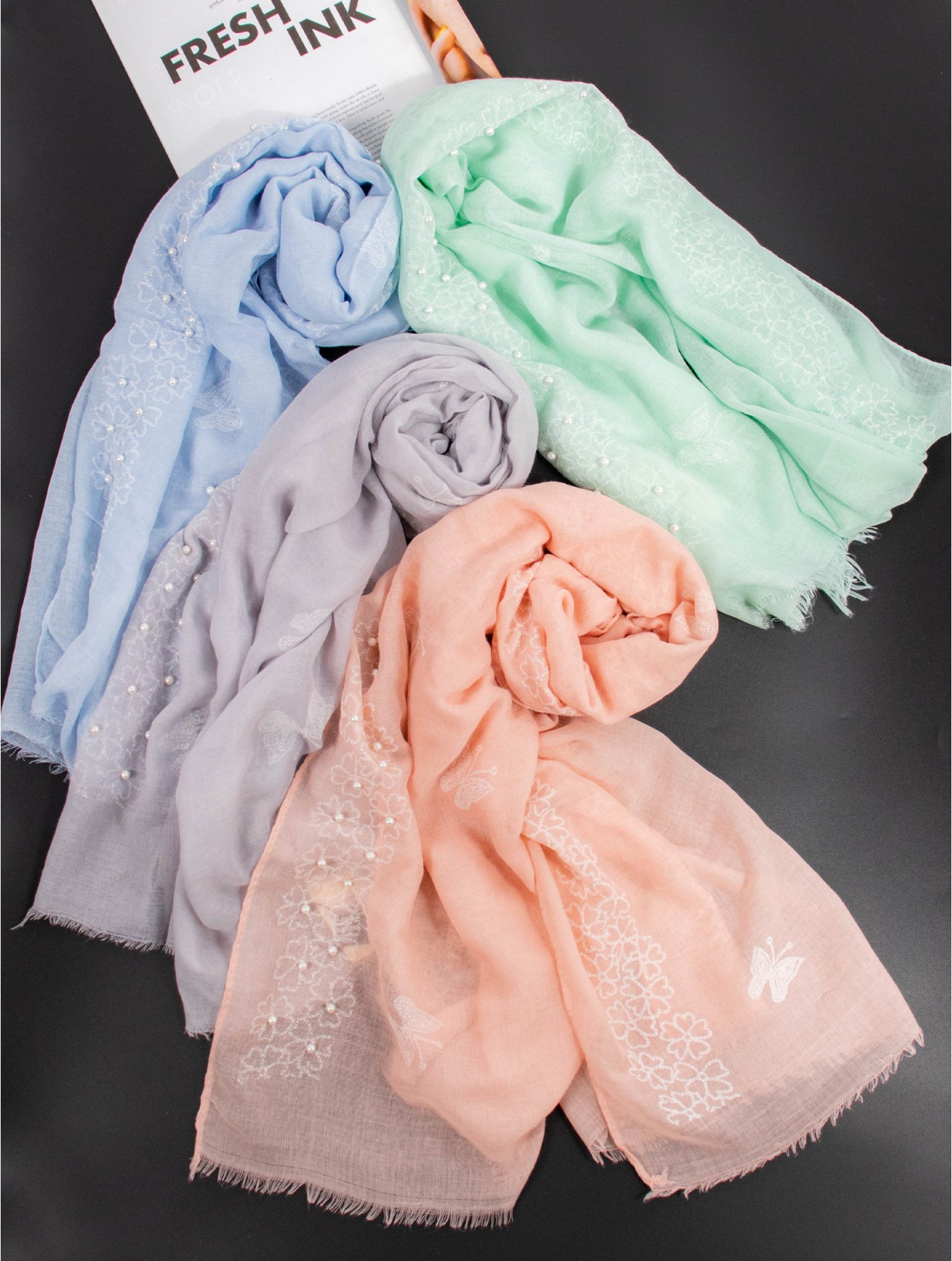 Tags: Butterflies & Pearls Stitch Print Fashion Scarf