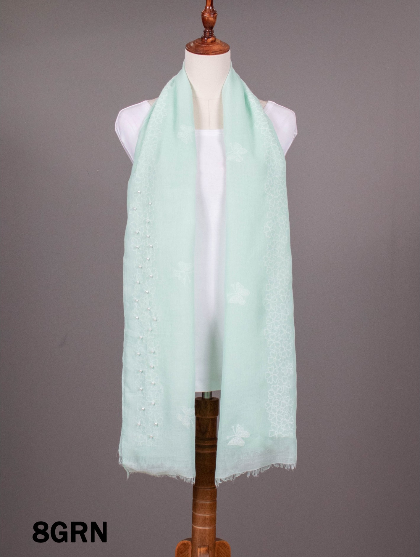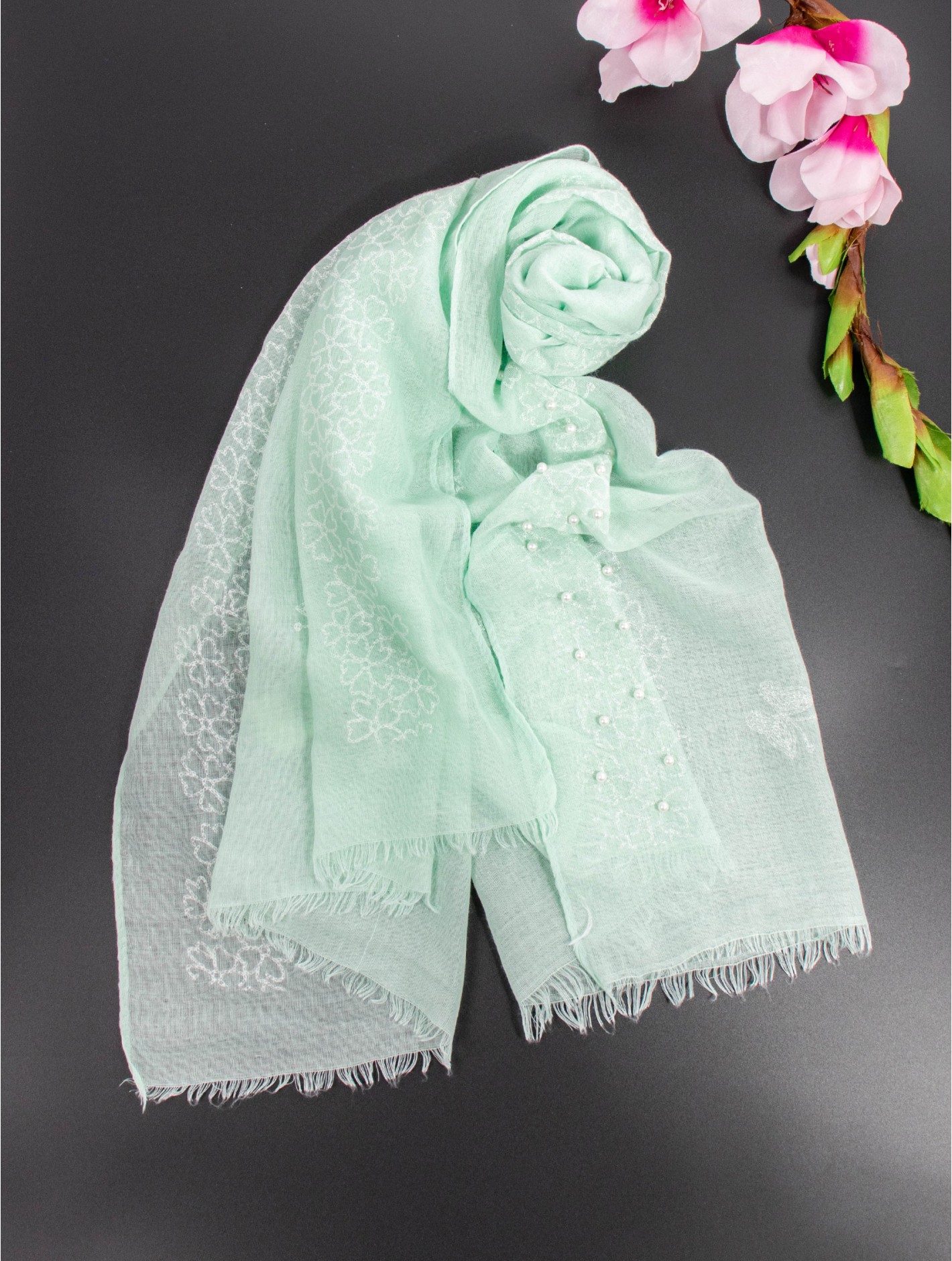 Minimum 4 pcs. Gorgeous Butterflies & Pearls Stitch Print Fashion Scarf that can be paired with multiple outfits. Light weight fabric that is great for any spring and summery styles. Colour: Green