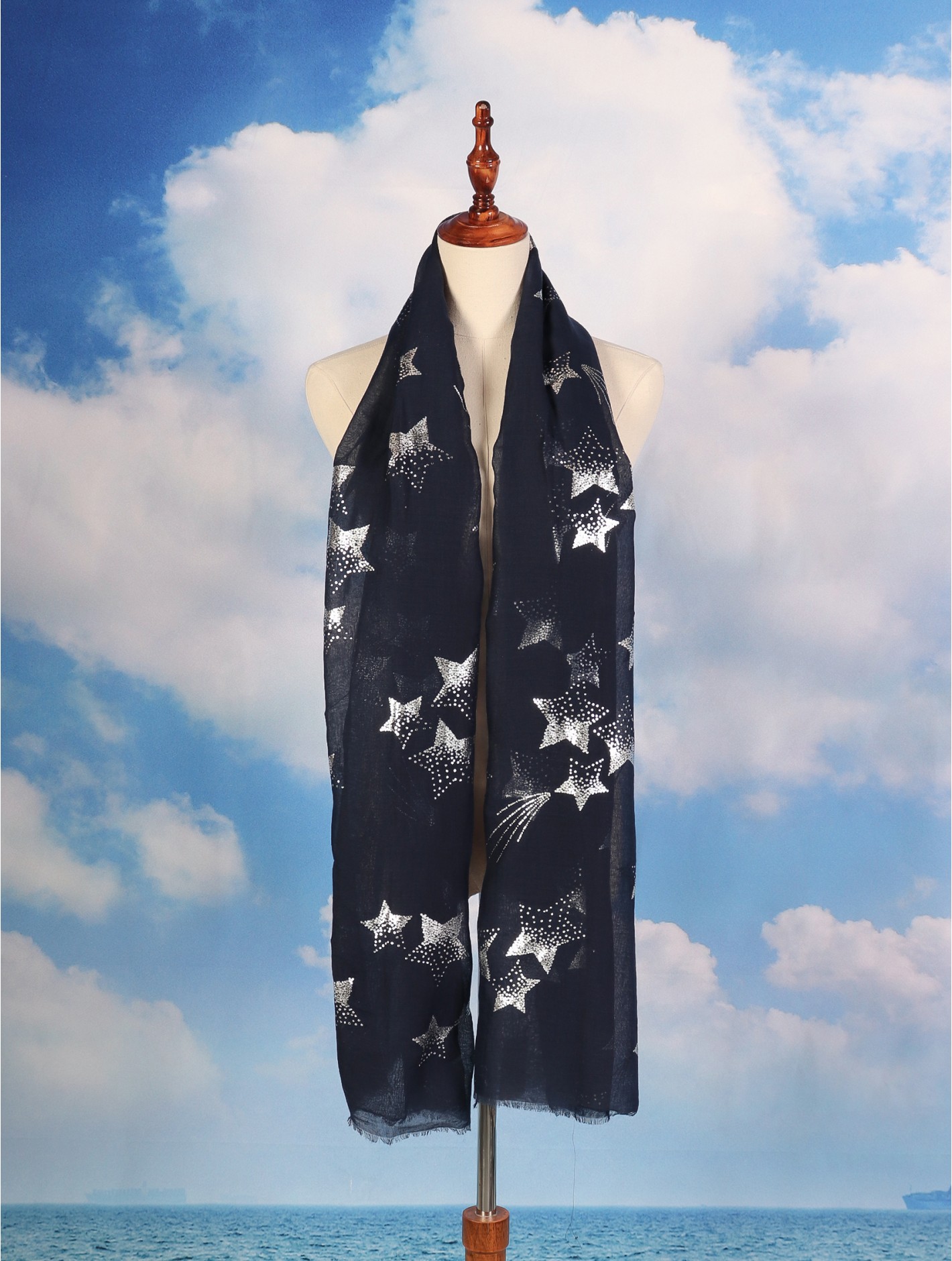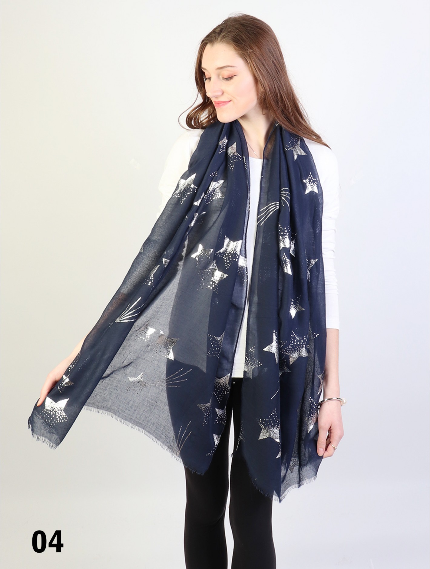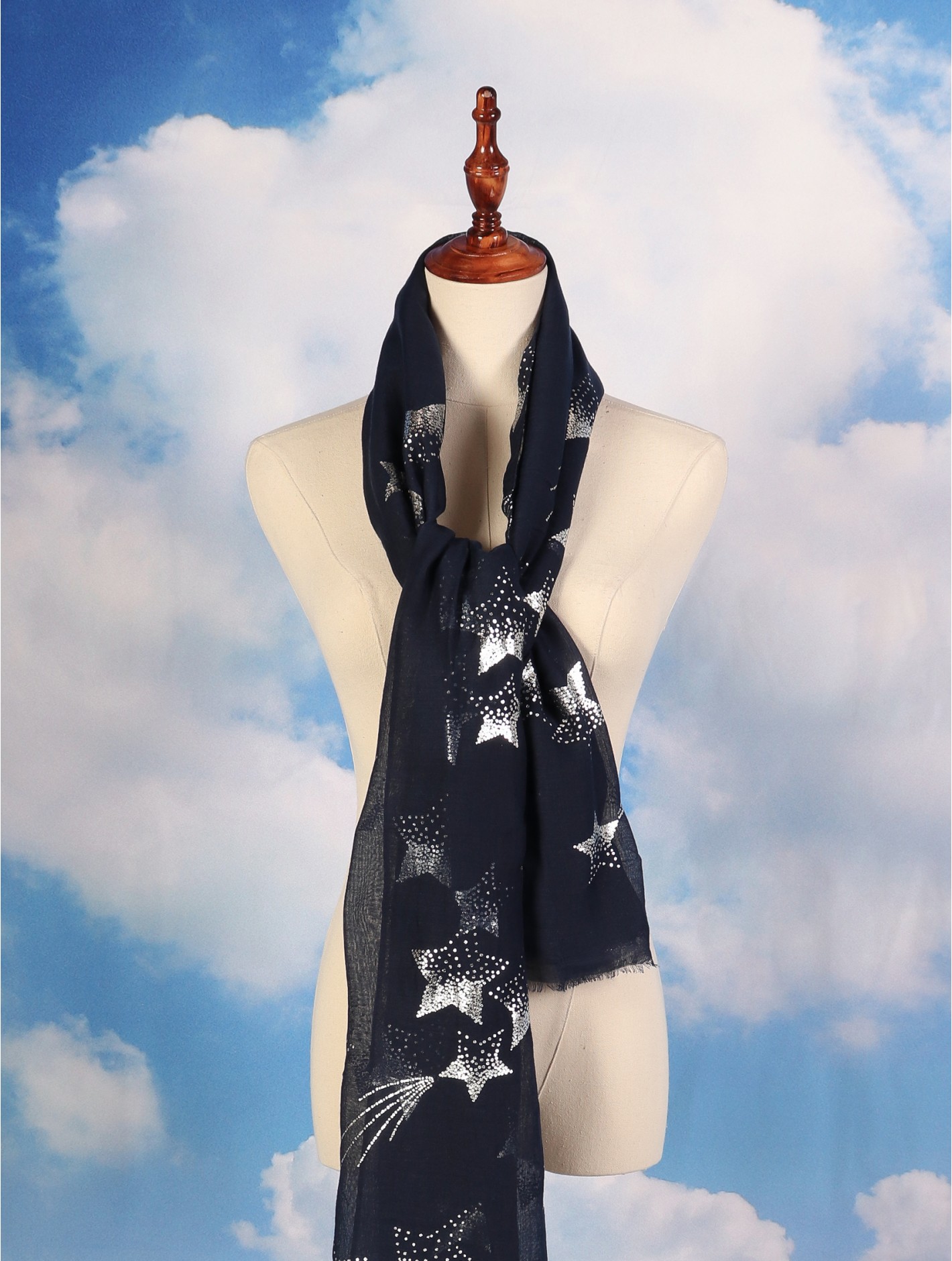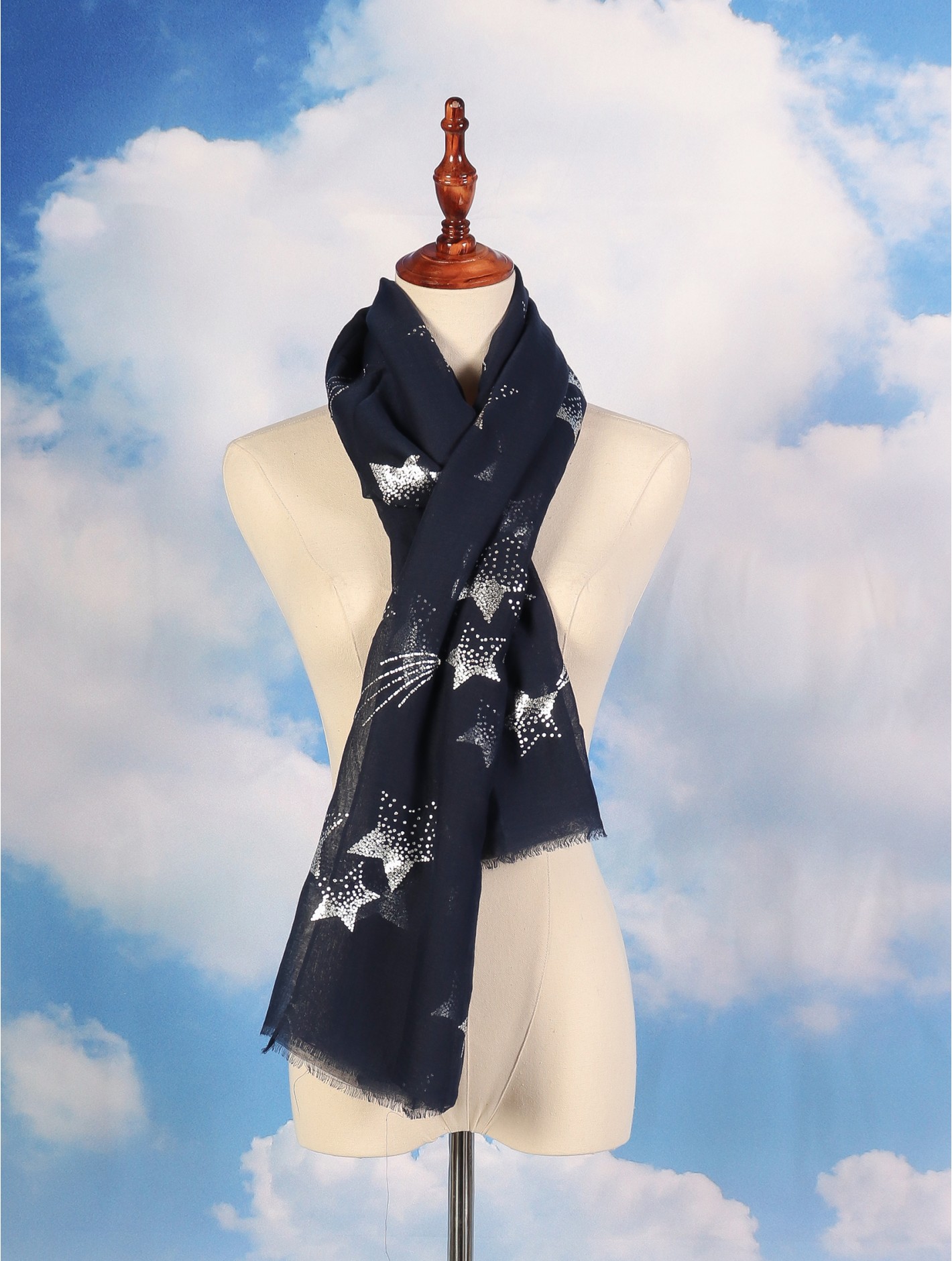 Minimum 4 pcs. Gorgeous Foil Stars patterned scarf that can be paired with multiple outfits. Light weight fabric that is great for any spring and summery styles. Colour: Navy