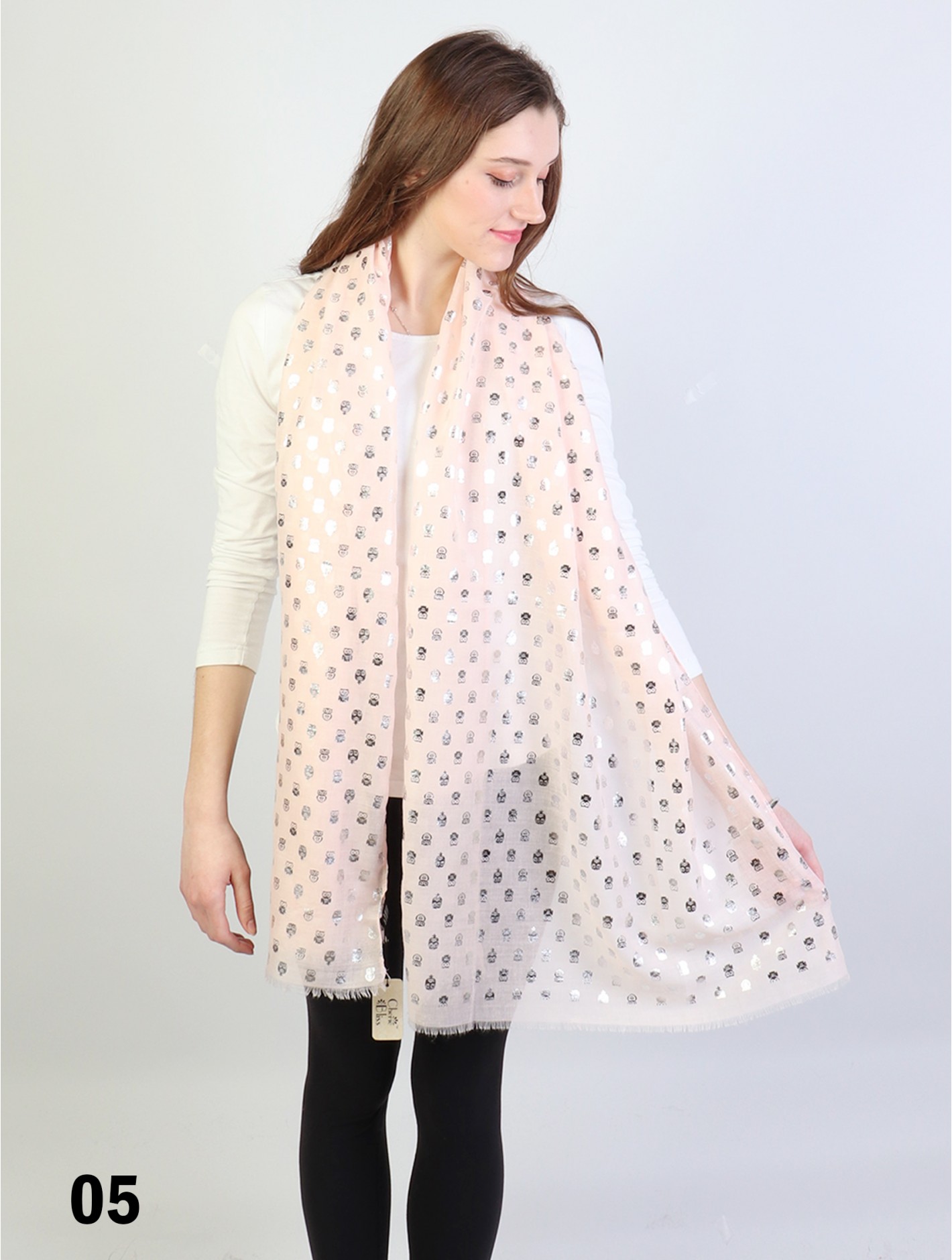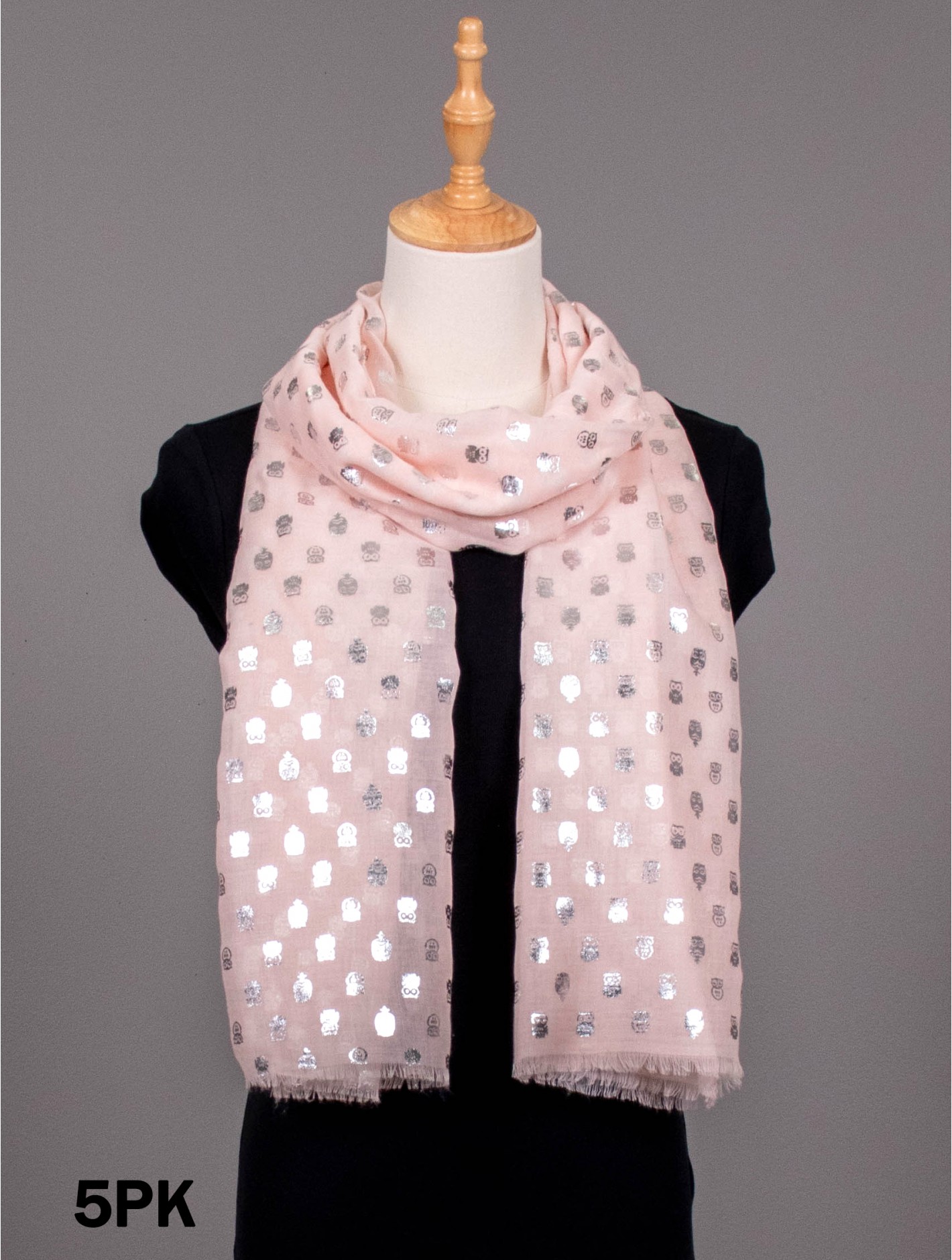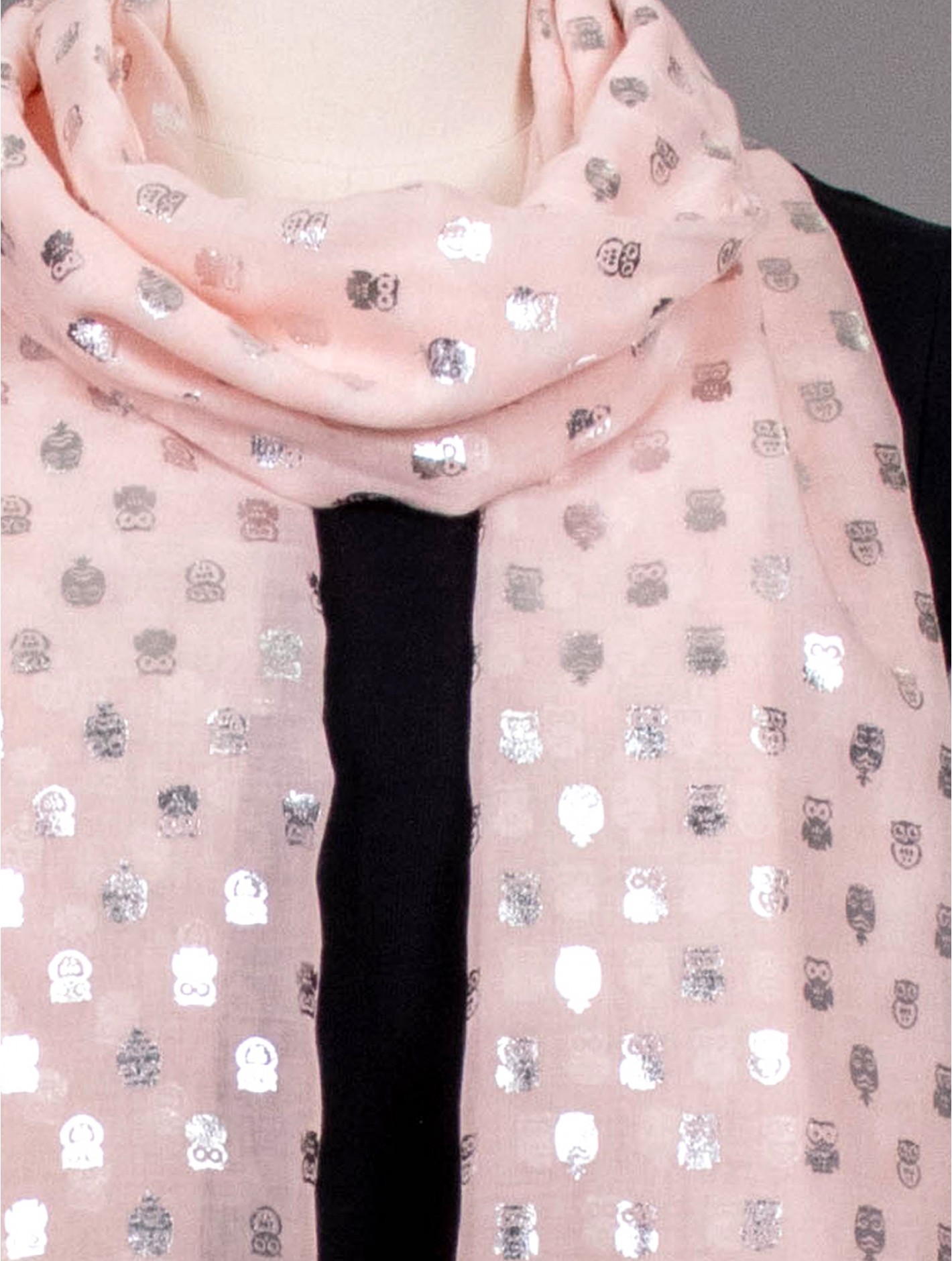 Minimum 4 pcs. Gorgeous metallic owl patterned scarf that can be paired with multiple outfits. Light weight fabric that is great for any spring and summery styles. Colour: Pink