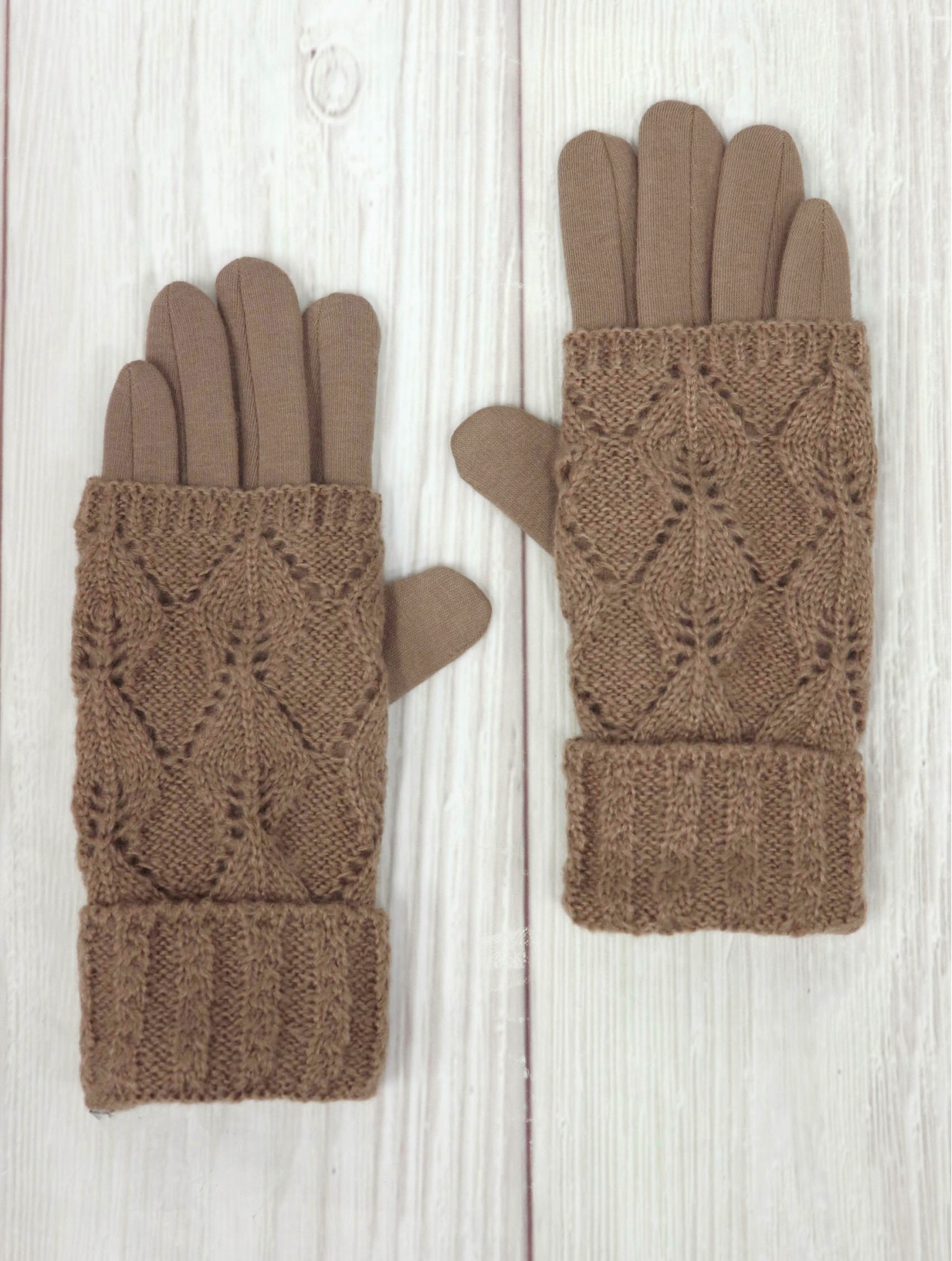 - Description: Minimum 2 pairs. New design with longer knitted layer to offer extra protection. Two ways to wear. Designed to keep your hands warm while still using a touch screen device. Magic knit detail. Cotton/Poly blend. Colour: Taupe