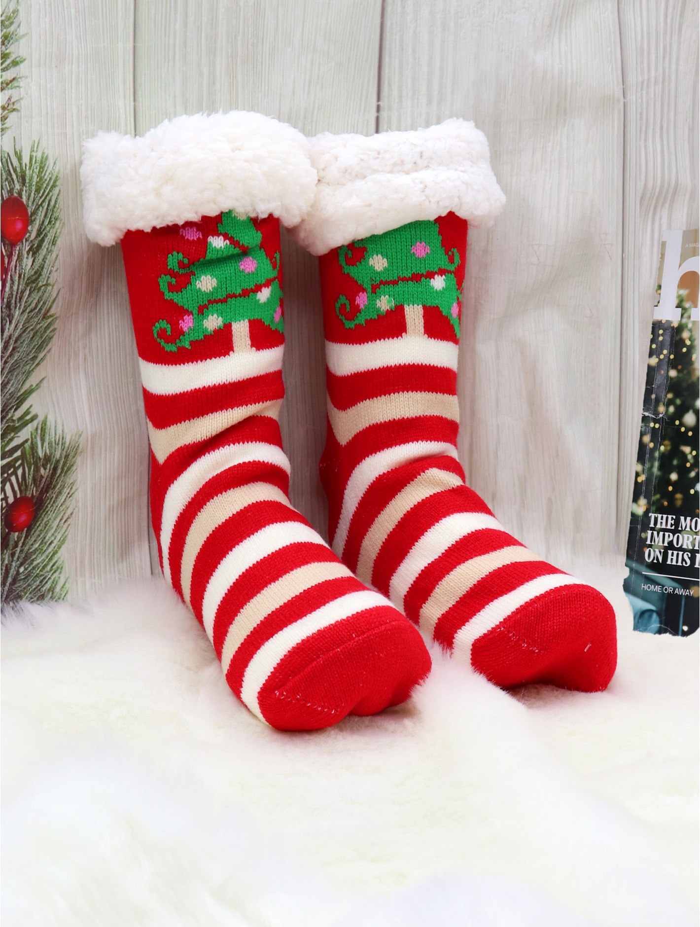 Holiday Tree and Striped Indoor Anti-Skid Slipper Socks (With Heel)