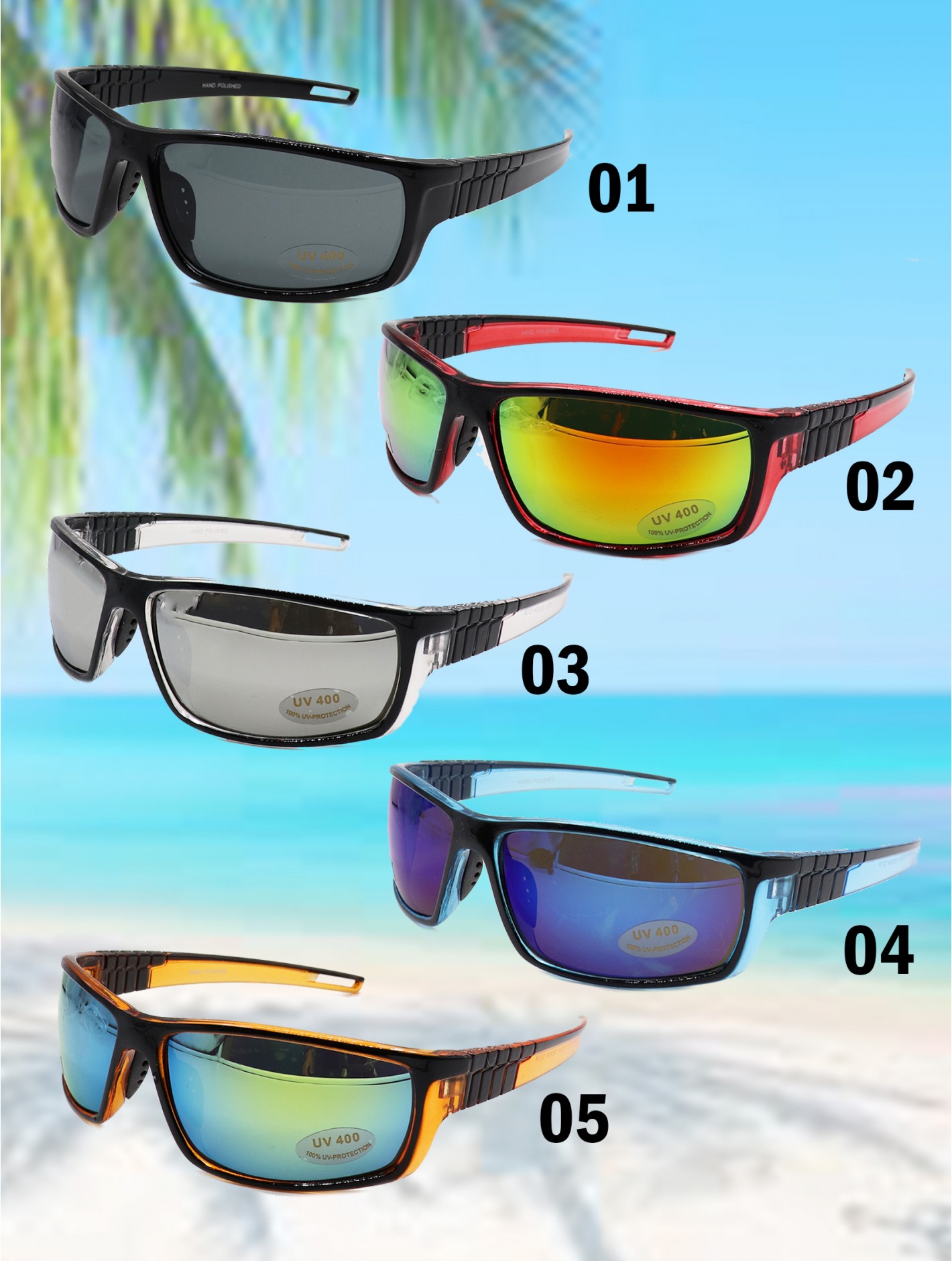 - Description: Popular sporty style sunglasses. Great for everyday use. Min 2 Pairs per colour.