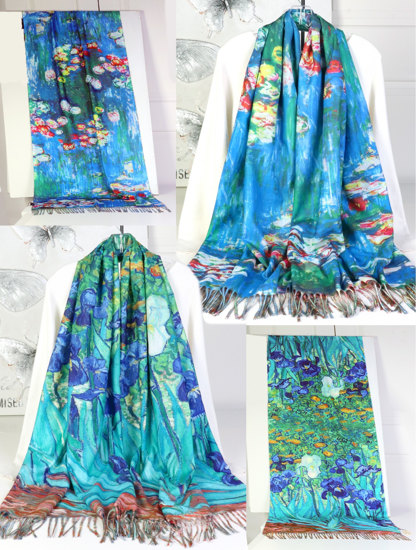 Double-sided Oil painting design fashion Scarf with tassels. Two different paintings to suit different occassions. Soft touch feeling, great for any spring and summery styles. Minimum 2 pcs.