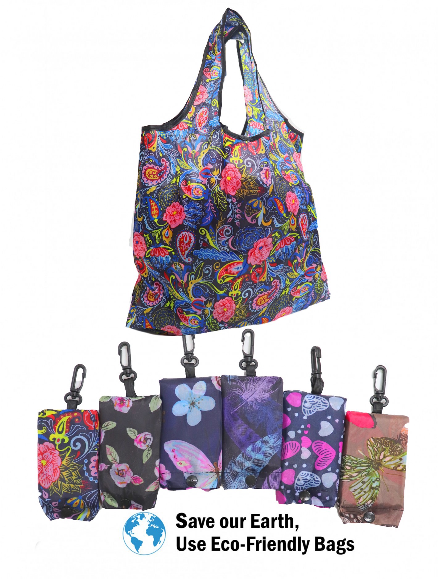 - Description: One set comes in 12 pcs Random assorted Designs, foldable shopping bags. Reusable Foldable Shopping ECO Bags. Large capacity with various pattern design. Easy store and carry in bag for convenient shopping bag use.